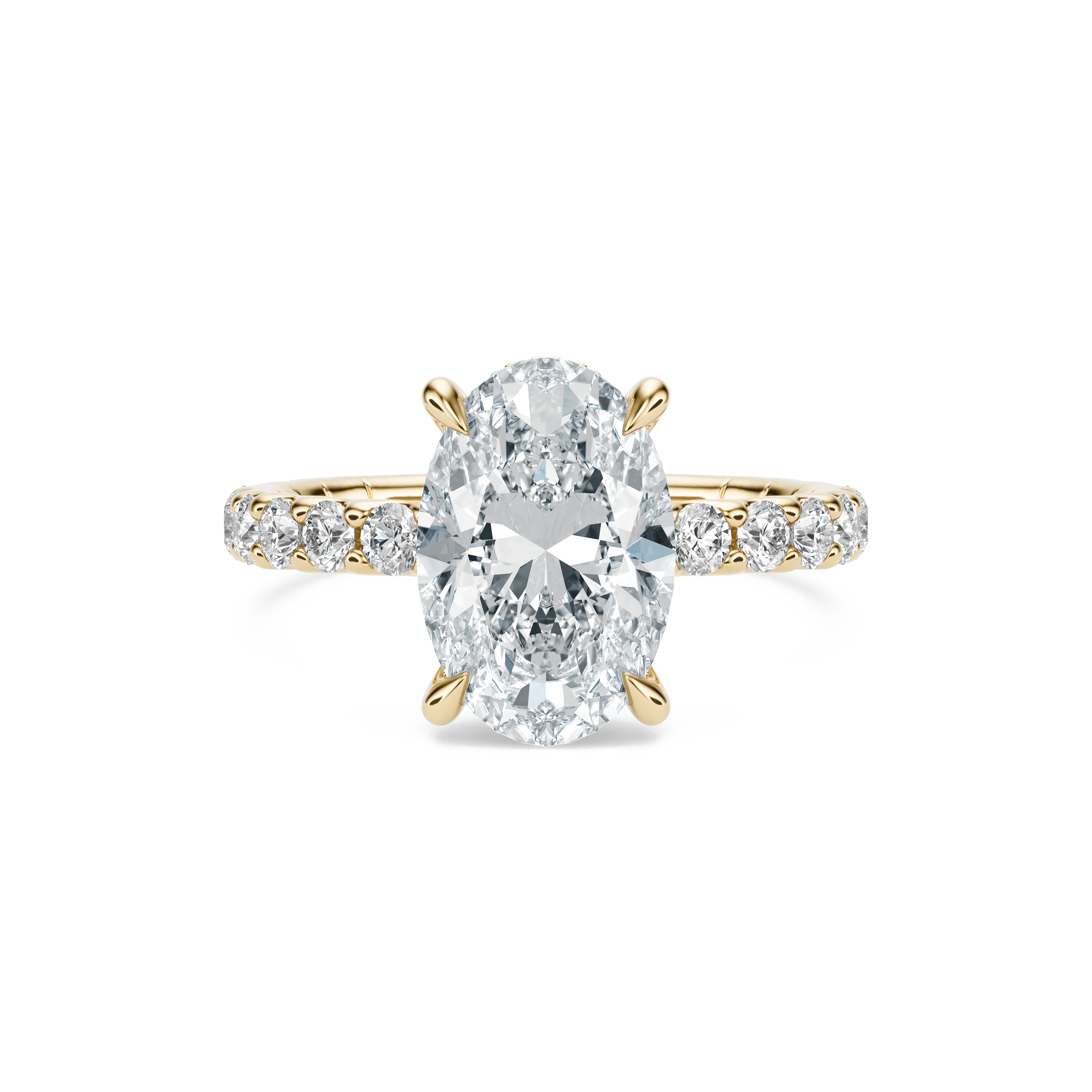 The standard version of our Bella Ring features the same scalloped edge band style, invisible halo, and pavé underside as our Founder Recommended version. The difference comes into play with the omission of the donut upgrade, which is great for those who prefer their stone to sit a touch higher or want to easily stack with other bands. If you'd like a center stone larger than 3.5ct, our team strongly recommends adding a donut or cathedral for additional structural integrity. Please note that a donut will set the stone so low that a traditional wedding band won't be able to stack perfectly flush. Want the best of both worlds with a flush stack and a donut? Contact us about our open bands for a custom fit at hello@eastwestgemco.com.