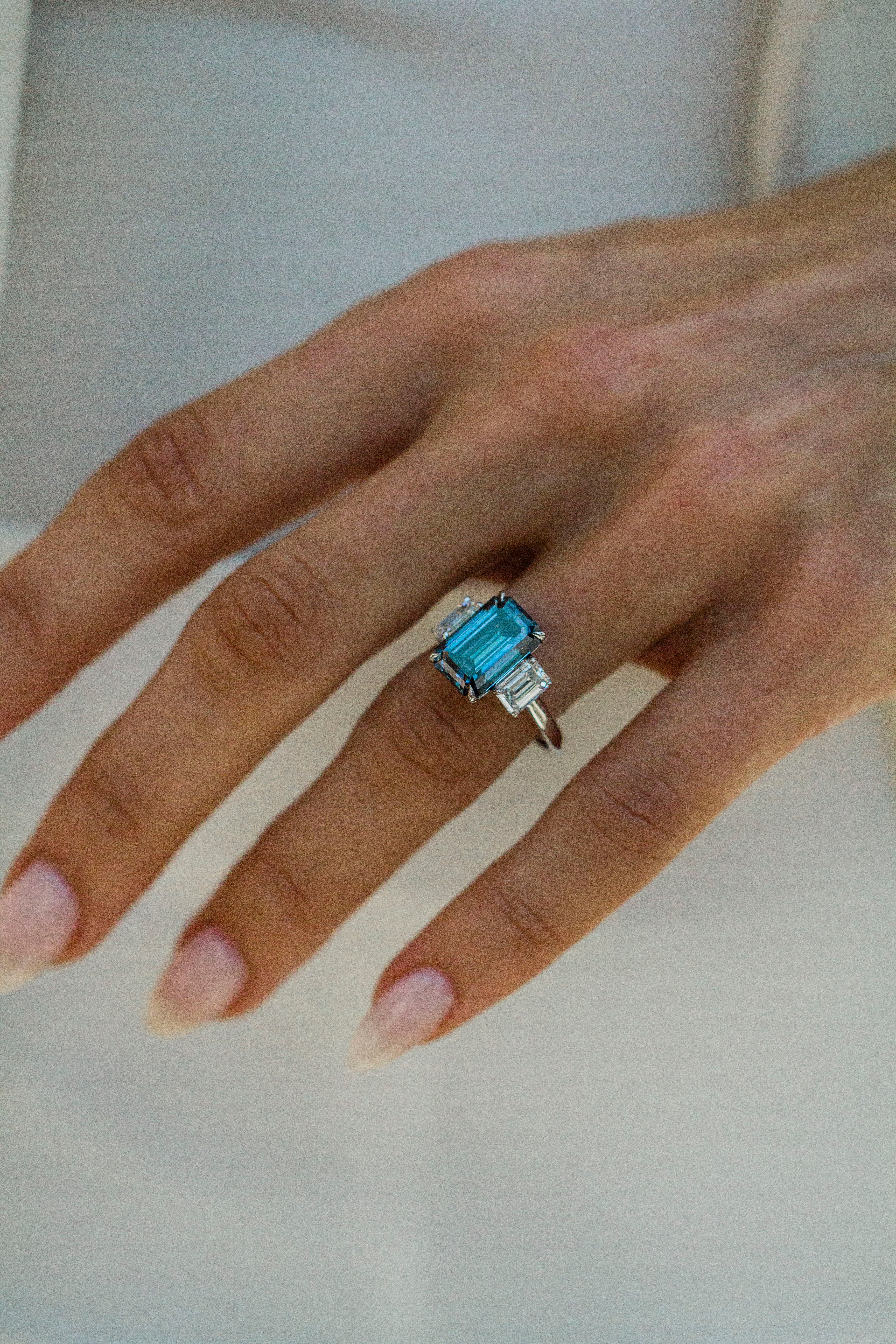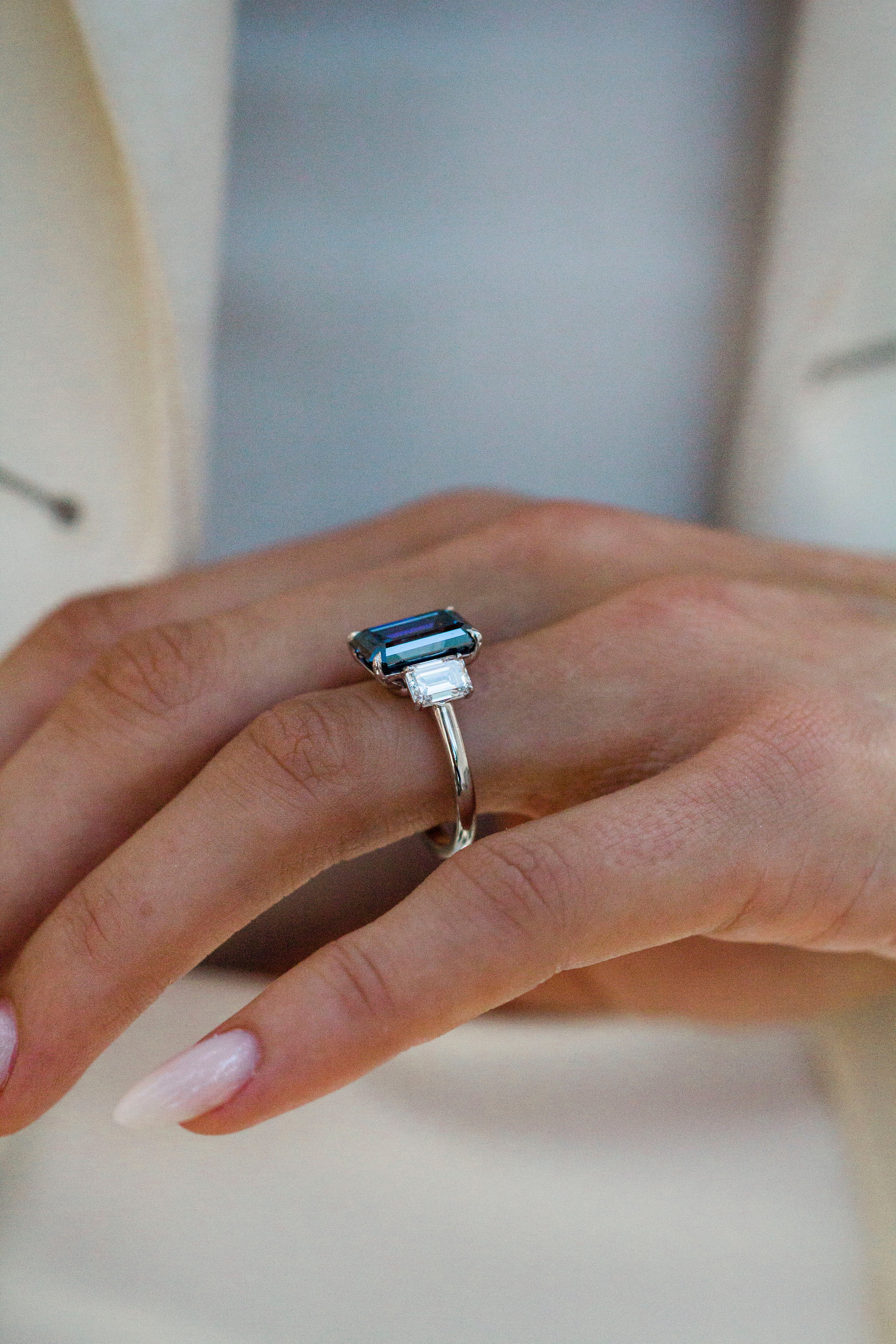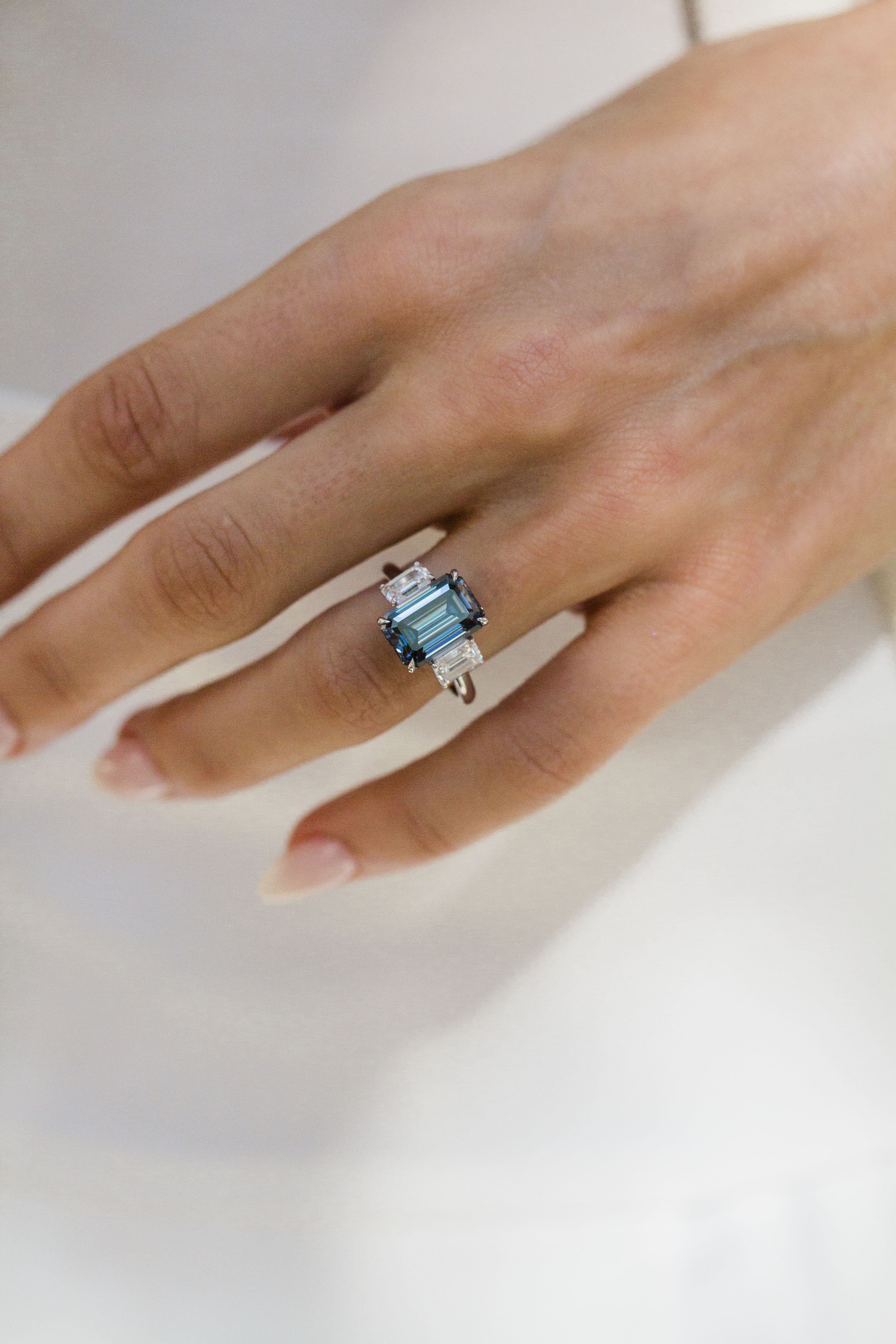 This Camilla ring showcases a striking 5 carat fancy blue moissanite step cut emerald, flanked by 6x4.25mm lab created diamond emerald side stones. All stones are secured with single claw prongs and a donut for added support. The ring is fully cast in 14K white gold, accentuating the rich color of both the center and side stones. A donut was added under the setting for extra support, and the piece is finished in 14K yellow gold. Please note that adding a donut sets the stone low, so most traditional wedding bands won’t stack perfectly flush. Want both a donut and a flush fit? Contact us about custom open bands at hello@eastwestgemco.com.