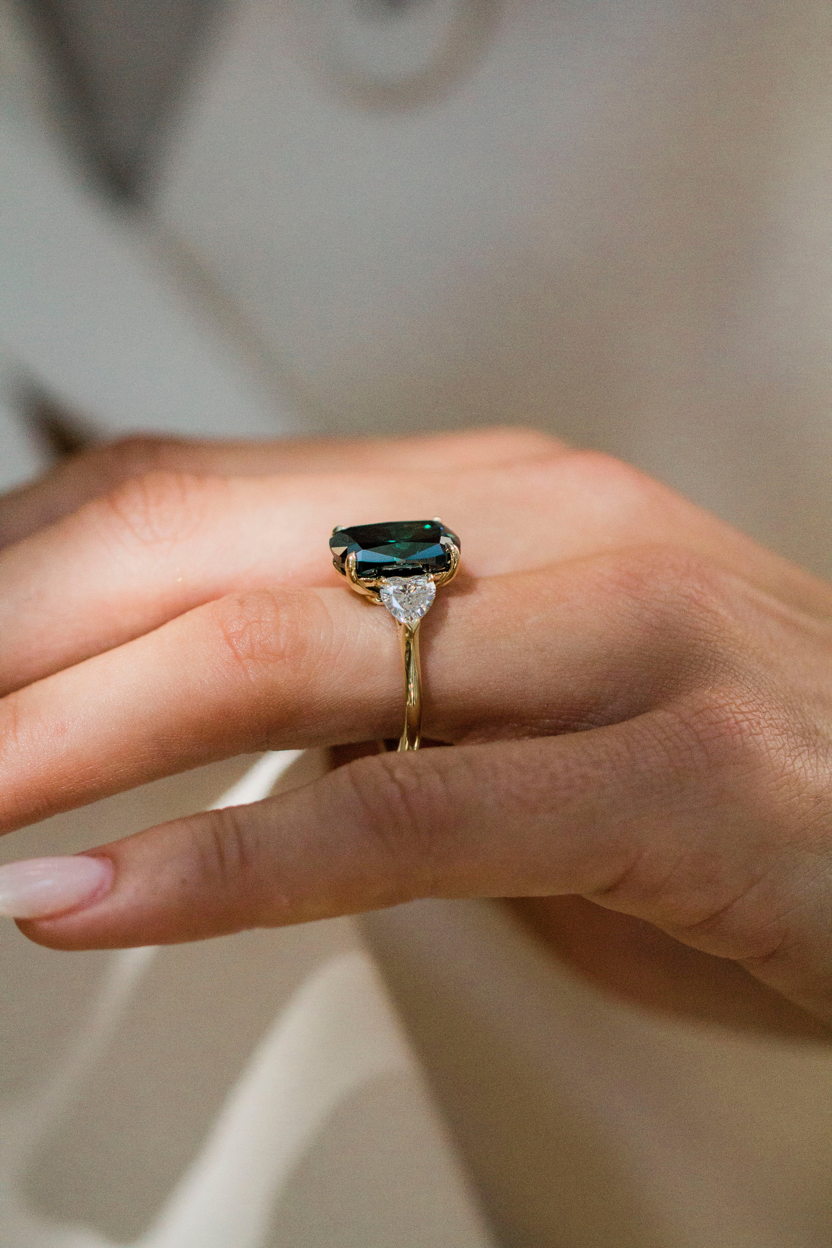 This Camilla features a stunning 7.2 carat fancy dark green moissanite crushed ice hybrid cushion, accented by 5.5×5mm lab-created diamond heart side stones. Cast entirely in 14K yellow gold, she showcases a 2.2mm solitaire band, a supportive donut, and single claw prongs for the perfect balance of elegance and sparkle. Please note that adding a donut sets the stone low, so most traditional wedding bands won’t stack perfectly flush. Want both a donut and a flush fit? Contact us about custom open bands at hello@eastwestgemco.com.