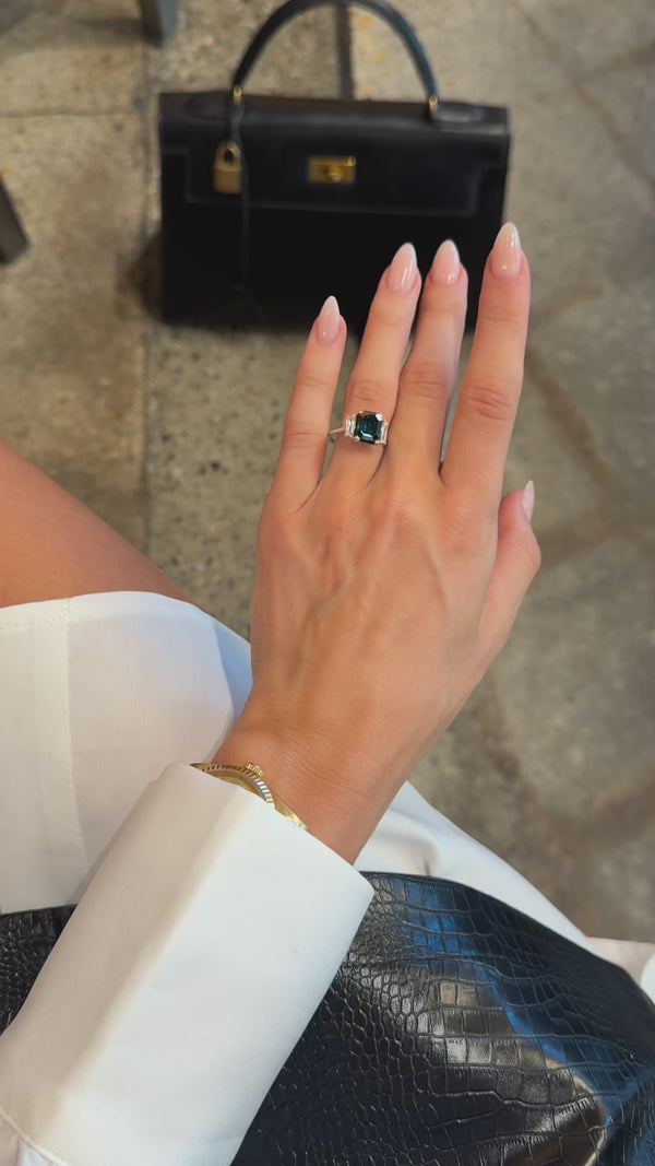 This Camilla ring features a breathtaking 4 carat fancy dark green step-cut moissanite center stone, flanked by twin mid-sized boat side stones. The ring is set on a 1.6mm solitaire band with heritage prongs to highlight the center stone. The 14K yellow gold head paired with a 14K white gold band gives this piece that effortlessly cool-girl edge.