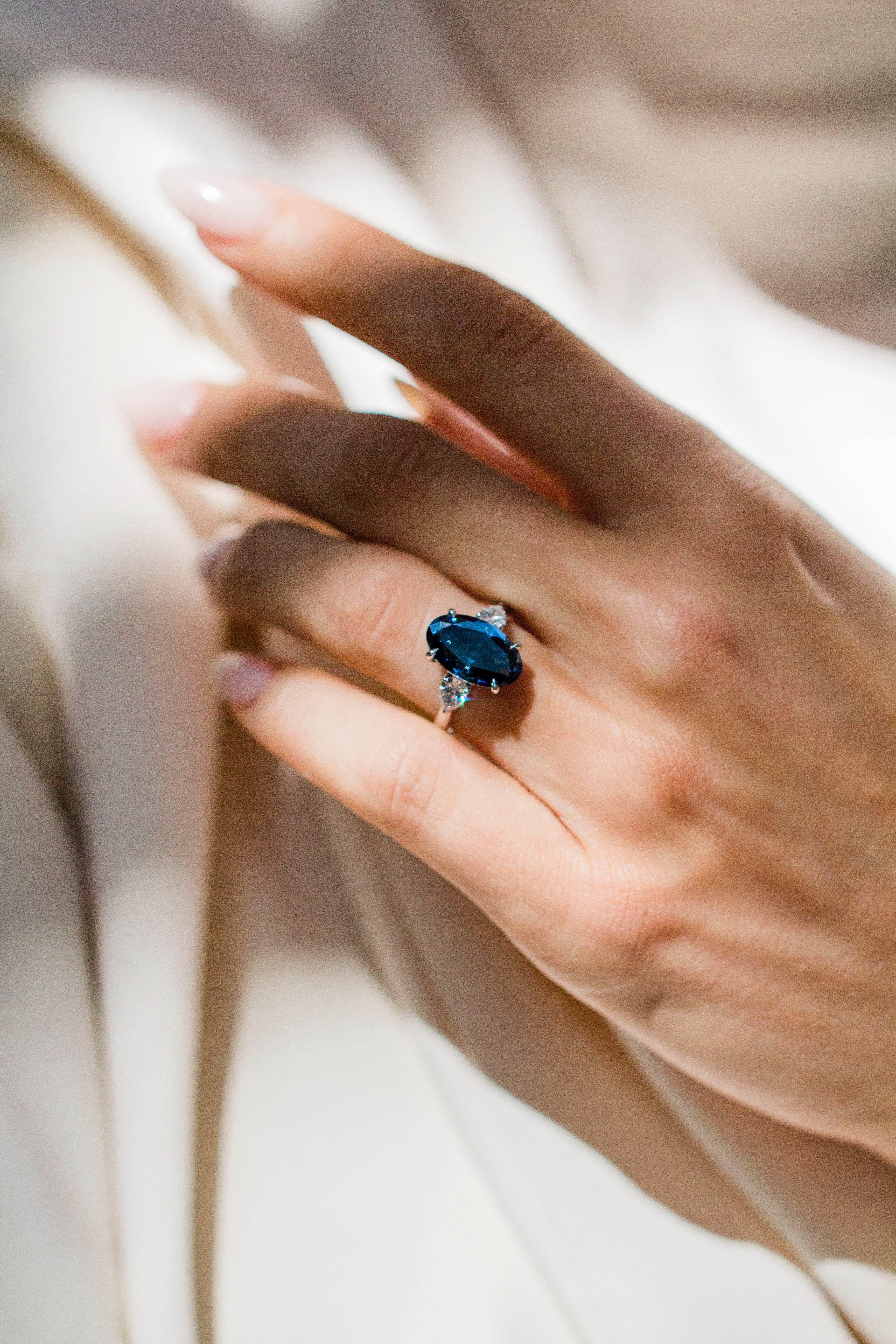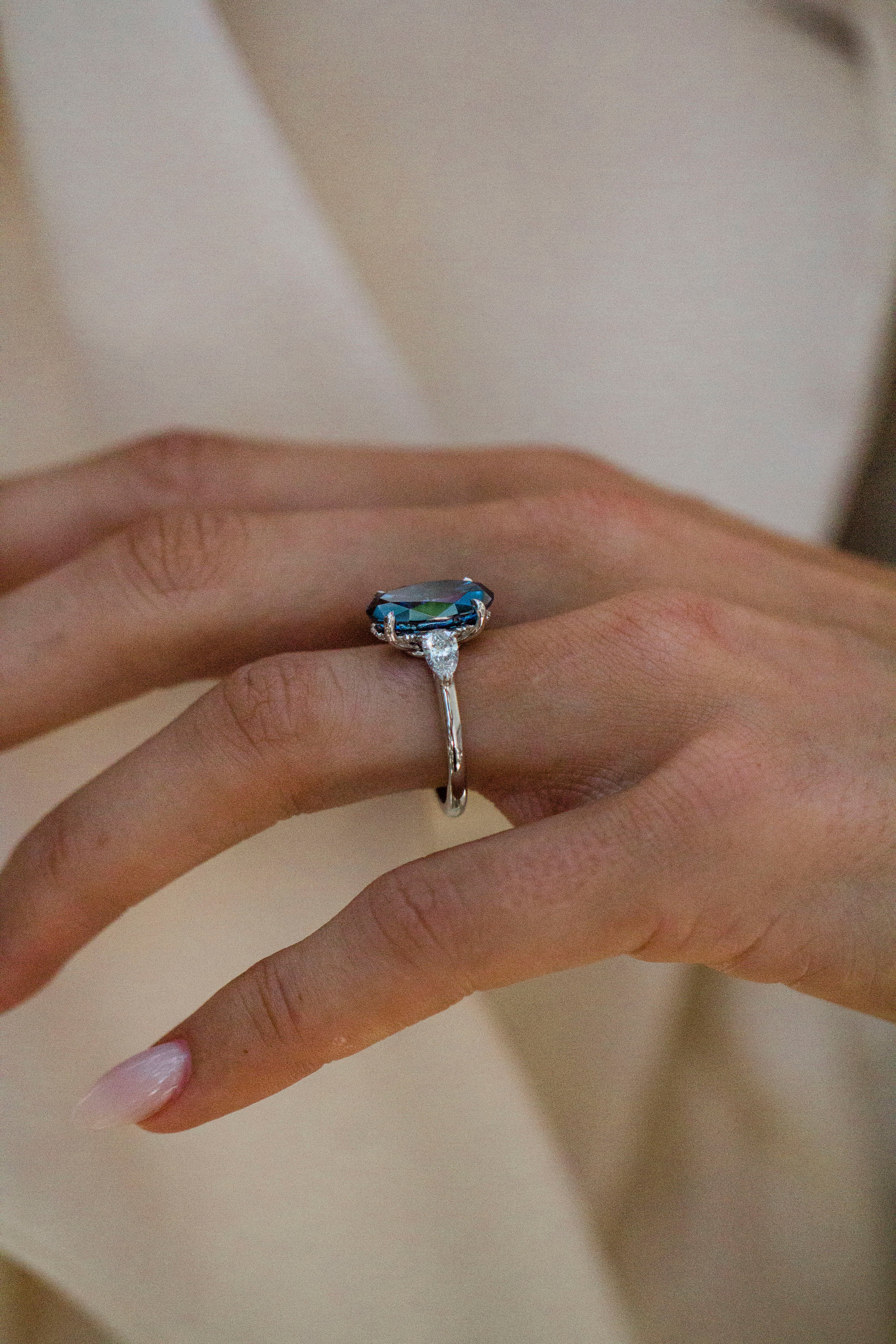 This three stone ring features a 6.3 carat elongated cornflower blue moissanite crushed ice hybrid oval center stone, paired with lab created diamond pear side stones for maximum sparkle. Set entirely in 14K white gold for the ultimate icy look, she showcases a 2mm solitaire band, a supportive donut to sit low on the finger, single claw prongs, and a pavé rail for delicate side profile shimmer. Please note that adding a donut sets the stone low, so most traditional wedding bands won’t stack perfectly flush. Want both a donut and a flush fit? Contact us about custom open bands at hello@eastwestgemco.com.
