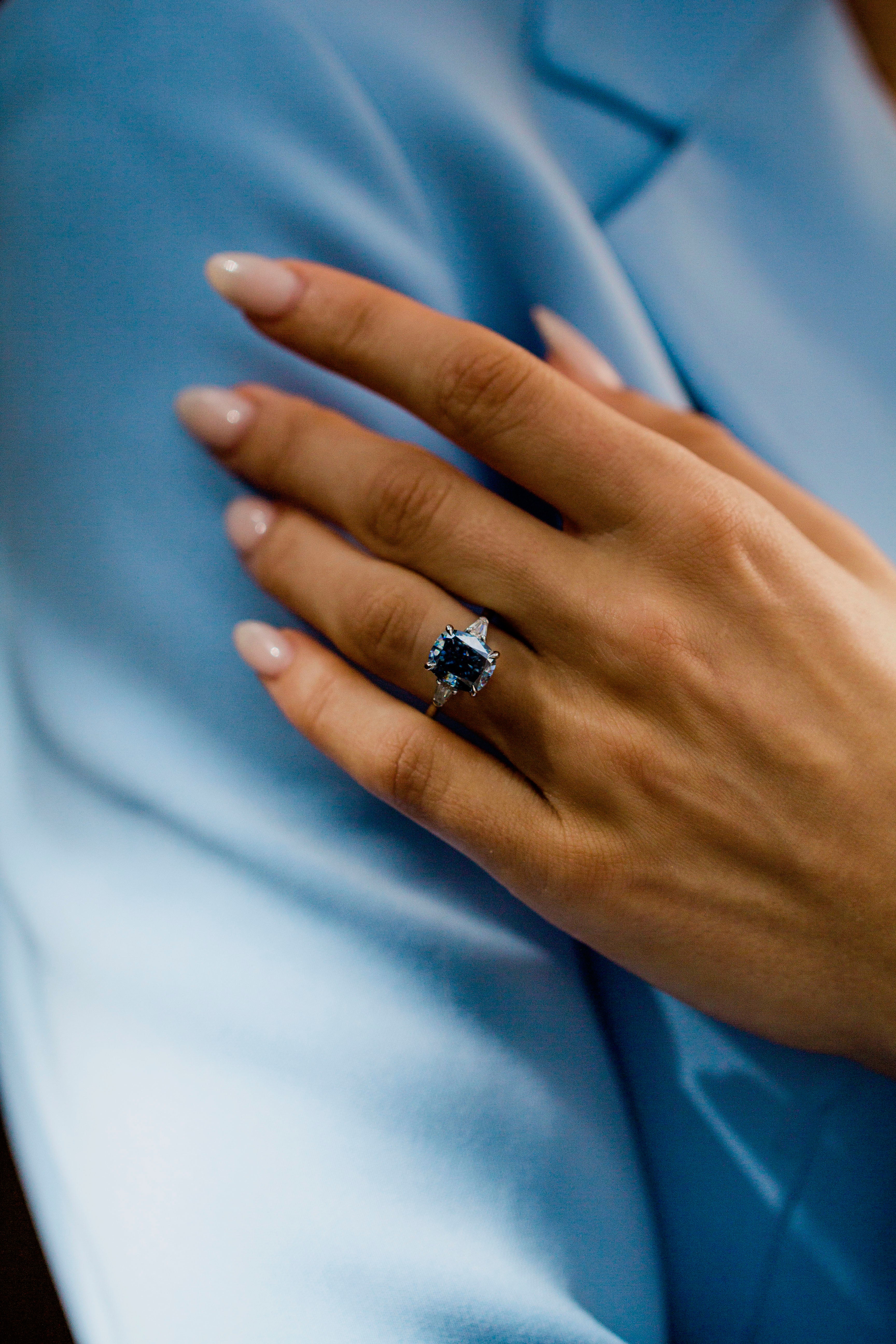 This icy Camilla ring showcases a one of a kind 3 carat cornflower blue moissanite crushed ice hybrid cushion. Set entirely in 14K white gold, she features a 1.6mm solitaire band, single claw prongs, and 4.5×3mm lab created diamond shield side stones for a touch of effortless sparkle.