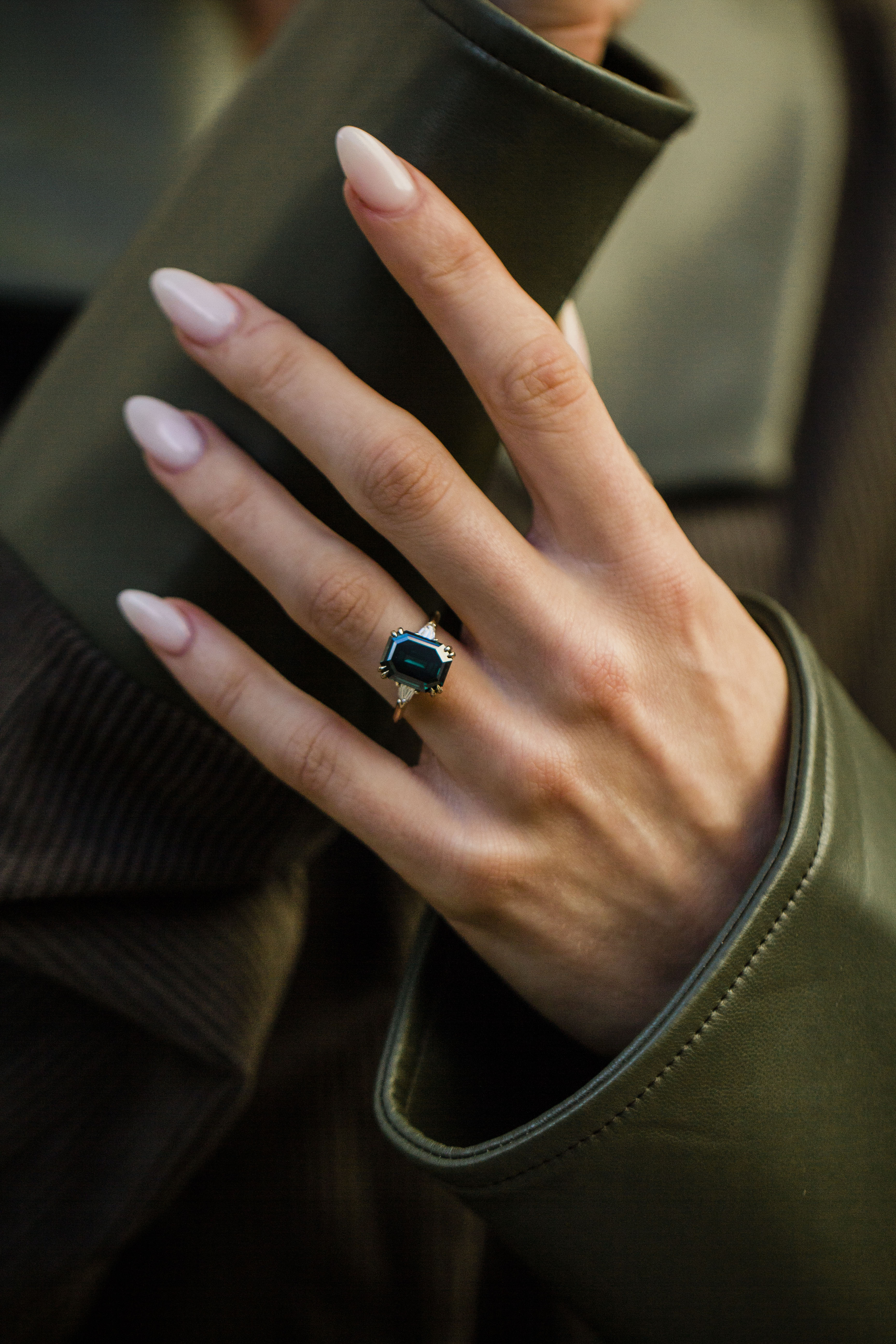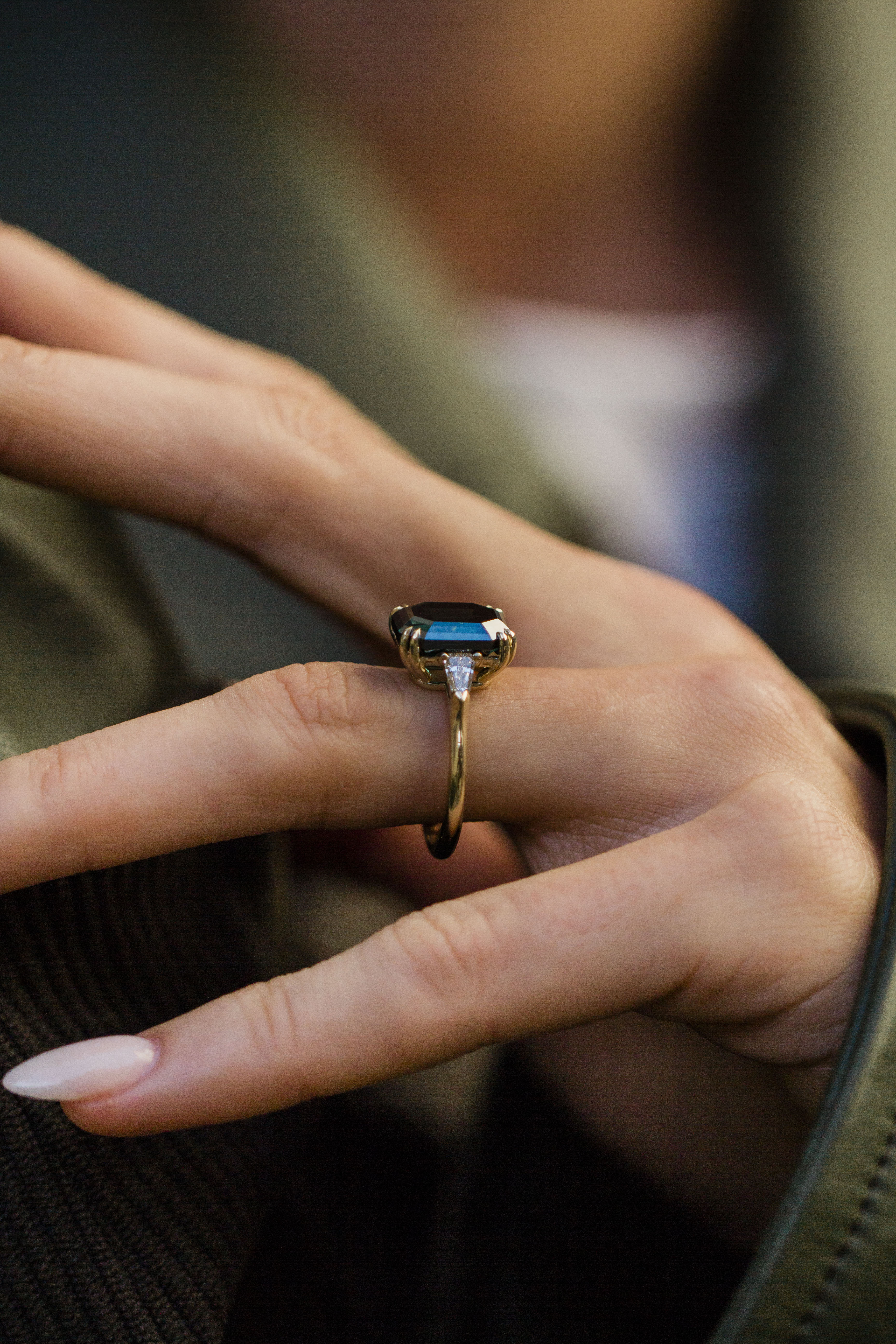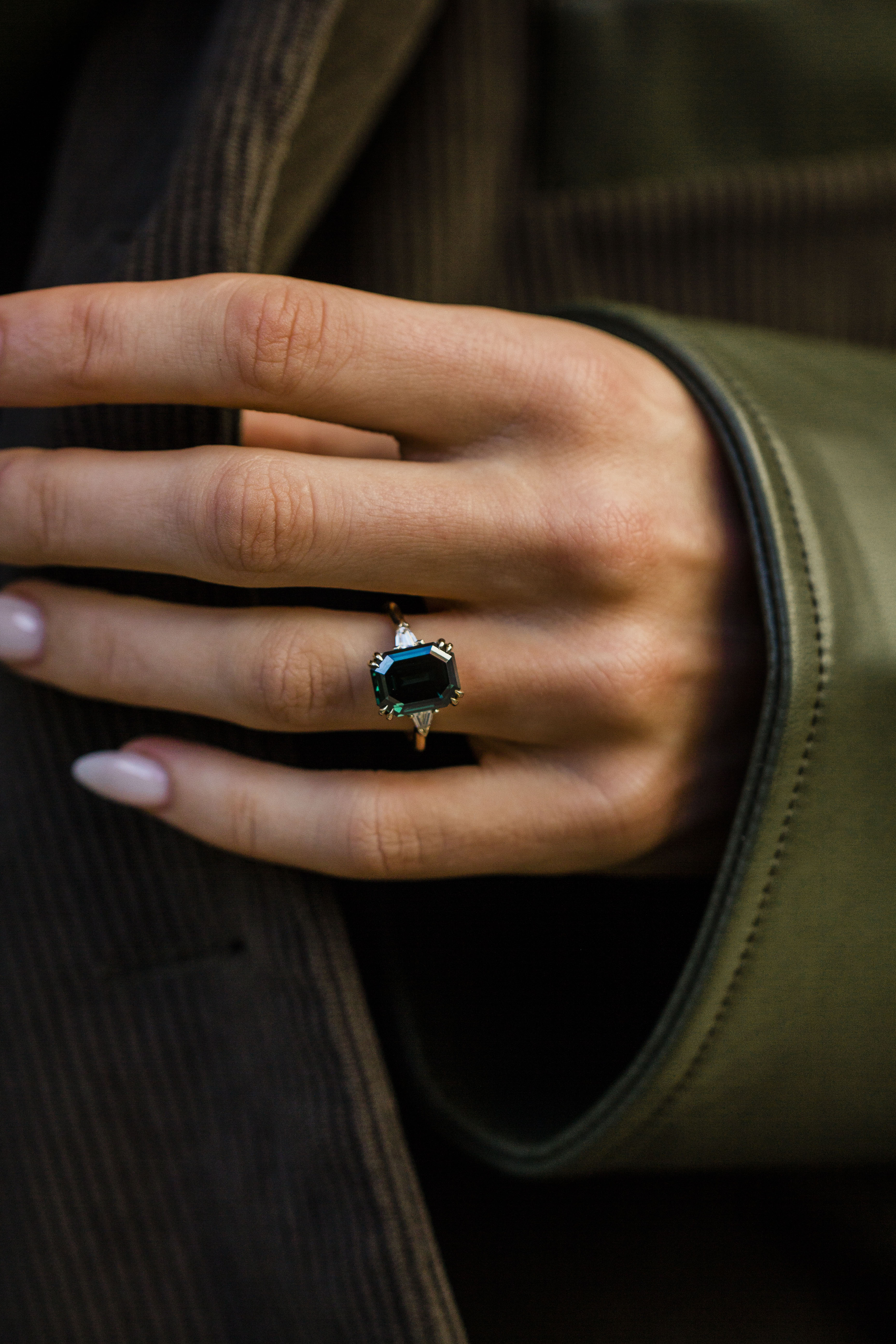 This Camilla features a perfectly saturated 5 carat fancy dark green step-cut emerald. Set entirely in 14K yellow gold, she showcases a sleek 2mm solitaire band, double claw prongs, and mid-sized tapered baguette side stones for the perfect touch of balance and elegance. Please note that adding a donut sets the stone low, so most traditional wedding bands won’t stack perfectly flush. Want both a donut and a flush fit? Contact us about custom open bands at hello@eastwestgemco.com.