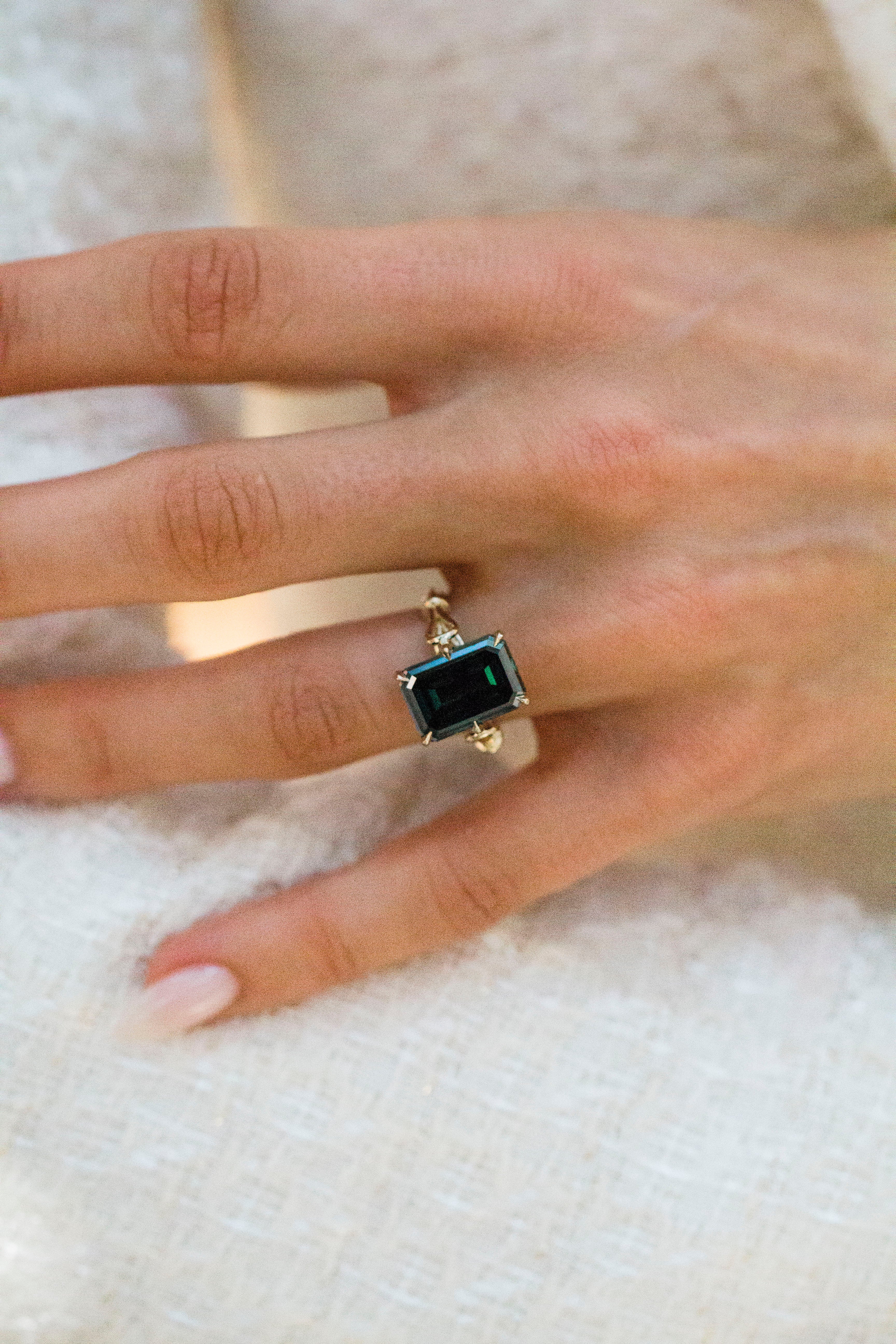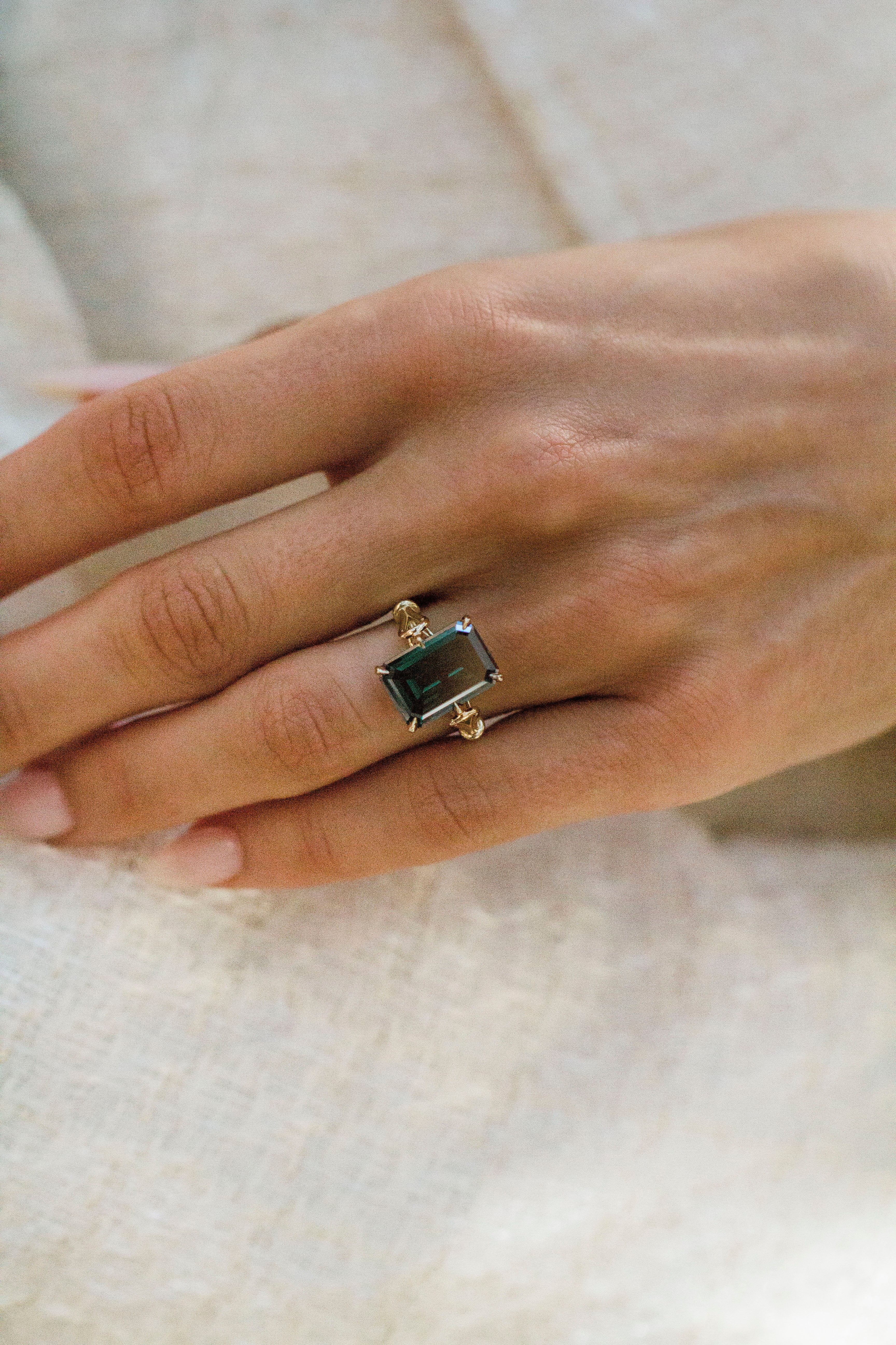 This ring features a 7 carat fancy dark green moissanite in a step-cut emerald shape. The center stone rests on a 2.5mm solitaire band with a vintage line, enhanced by a unique Georgian loop cathedral. A supportive donut keeps the stone close to the finger, while six delicate microprongs add subtle detail. Cast entirely in 14K yellow gold, this ring balances bold color with timeless elegance. Please note that adding a donut sets the stone low, so most traditional wedding bands won’t stack perfectly flush. Want both a donut and a flush fit? Contact us about custom open bands at hello@eastwestgemco.com.