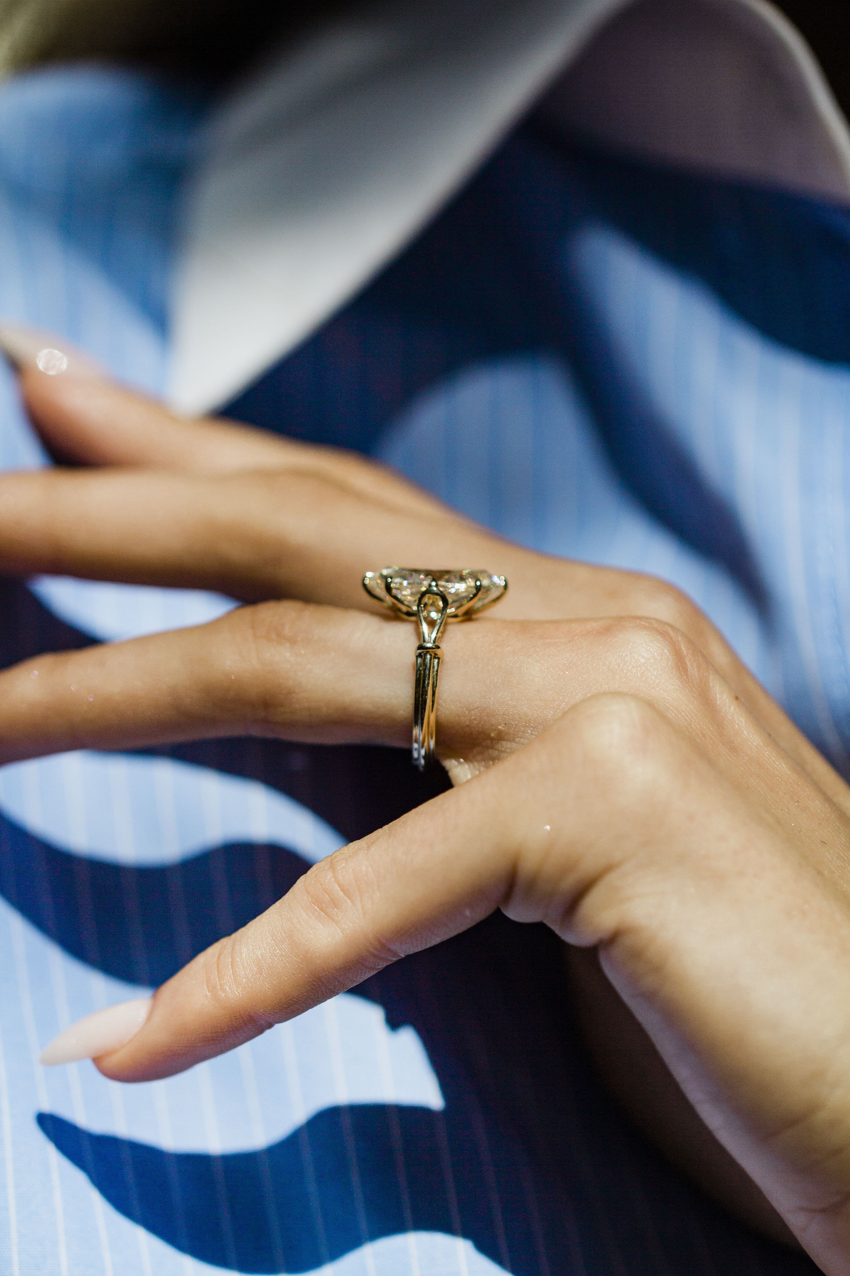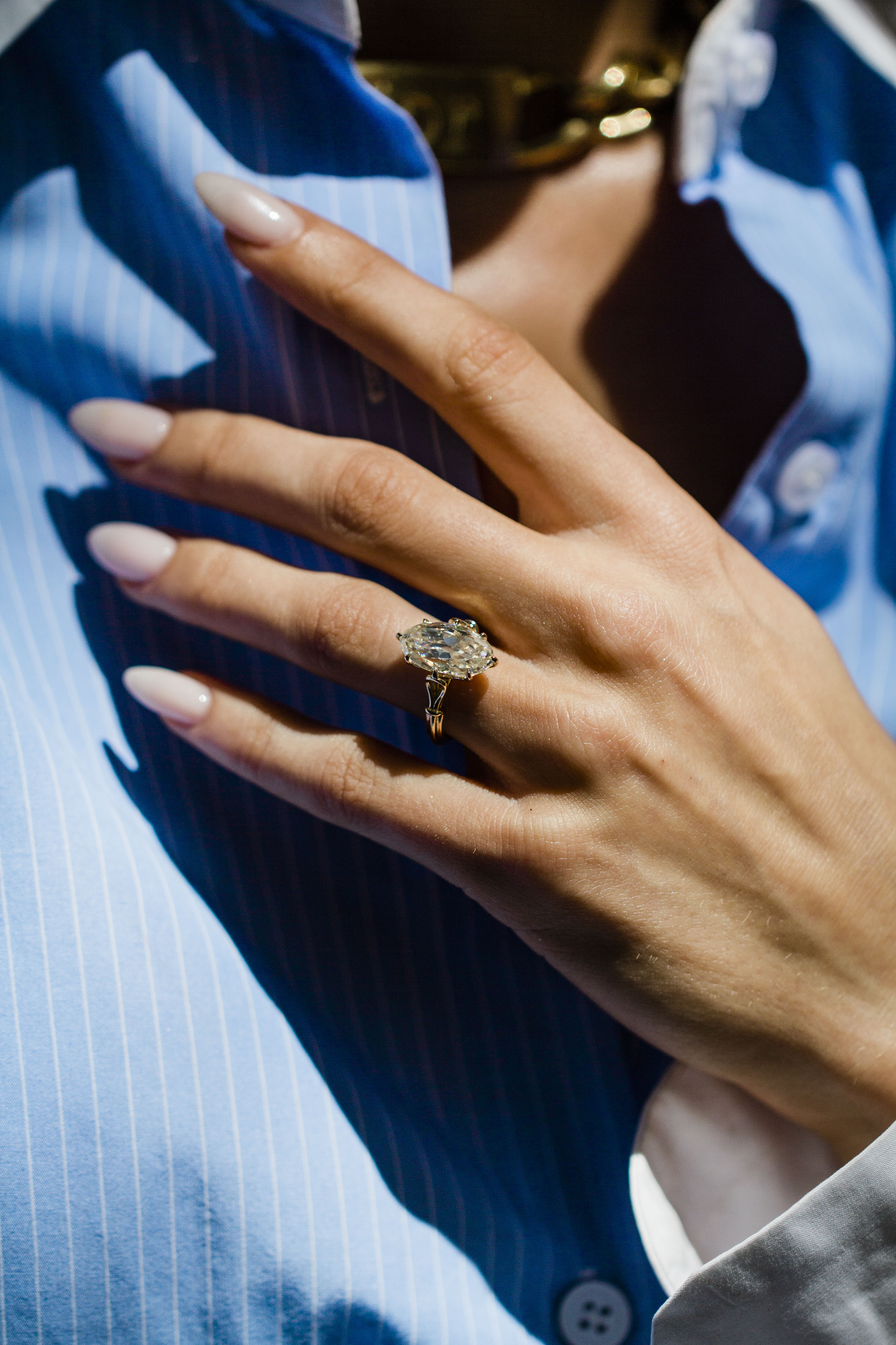 This ring features a 10.8 carat Old Mine oval moissanite in our vintage white color, measuring 15x8.75mm with a 1.71 ratio for dramatic elongation and presence. We set it with eight claw prongs in a Georgian loop cathedral design and placed it on a reverse tapered solitaire band with a vintage line detail. The piece is finished in 14K yellow gold, with a donut upgrade for extra support. Please note that adding a donut sets the stone low, so most traditional wedding bands won’t stack perfectly flush. Want both a donut and a flush fit? Contact us about custom open bands at hello@eastwestgemco.com.