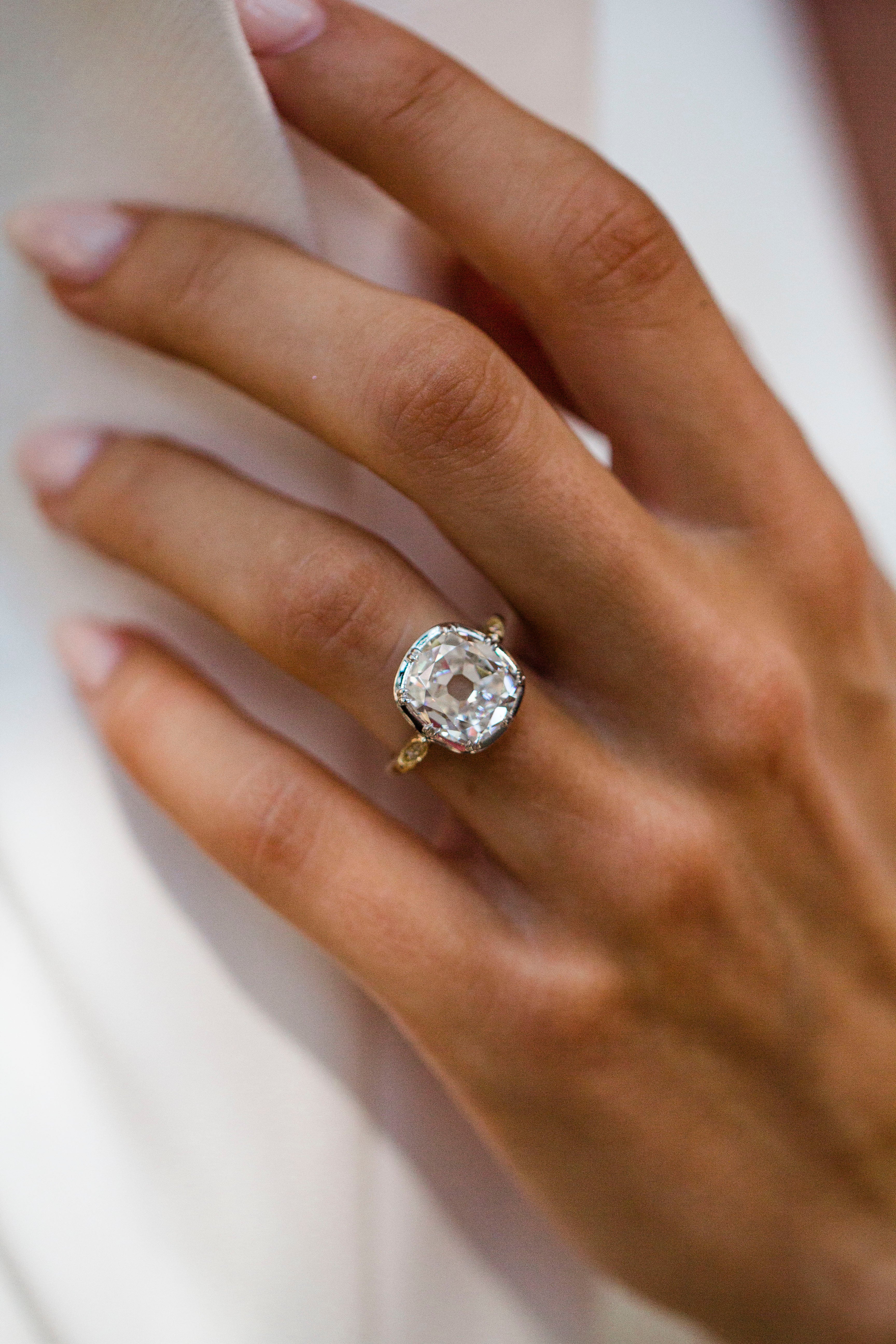 This ring is a unique combination of our Harlow and Georgina signature styles. It features a 5.6 carat Old Mine cushion slice moissanite in our modern white color, measuring 10.75x10.25mm with a 1.04 ratio for a softly squared profile. We set it in our Georgina bezel with sixteen dainty double claw prongs and added a donut under the setting for extra support. The center sits on a 1.65mm solitaire band with vintage line detail and triple melée accents, finished with a 14K yellow gold band and 14K white gold head. Please note that adding a donut sets the stone low, so most traditional wedding bands won’t stack perfectly flush. Want both a donut and a flush fit? Contact us about custom open bands at hello@eastwestgemco.com.