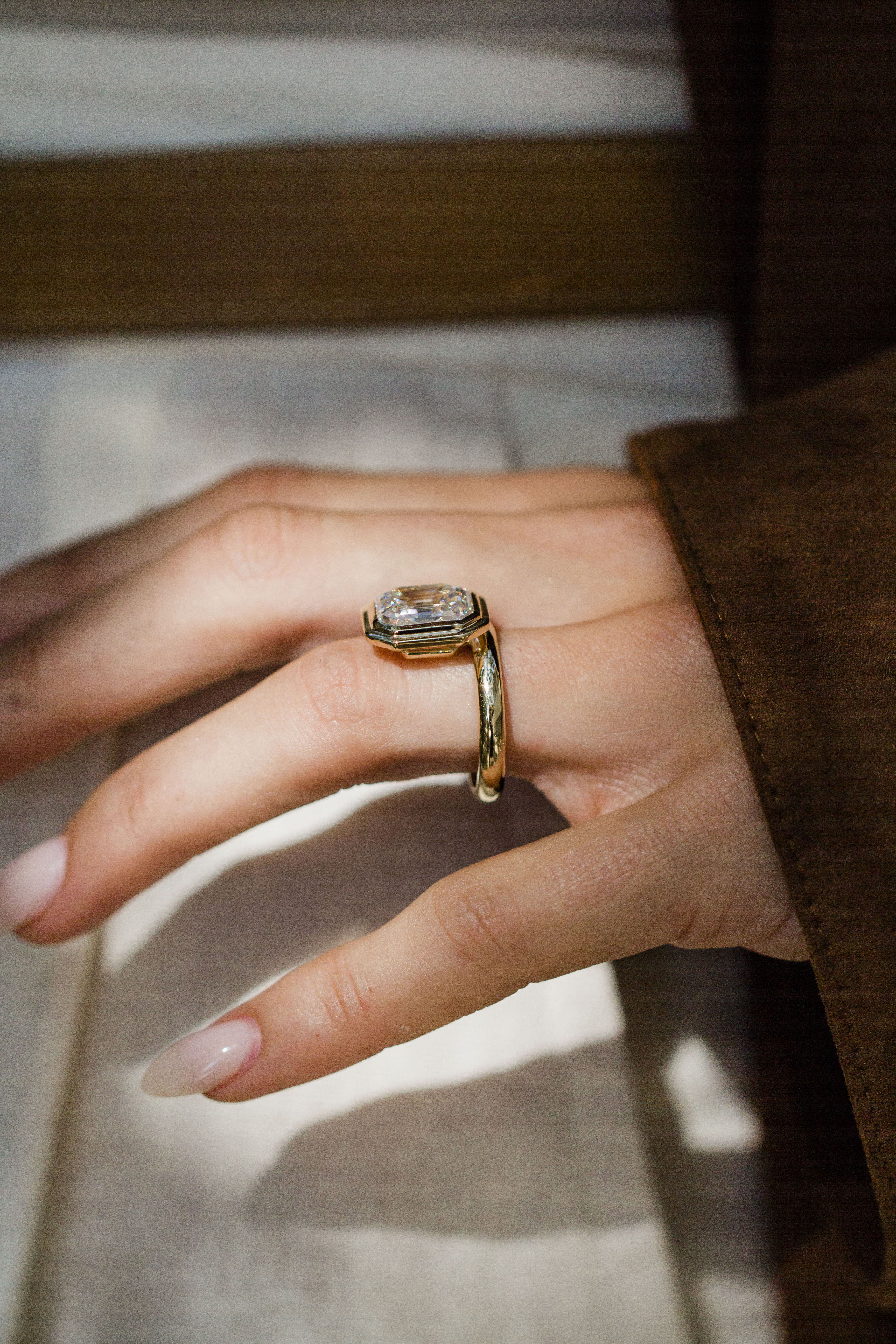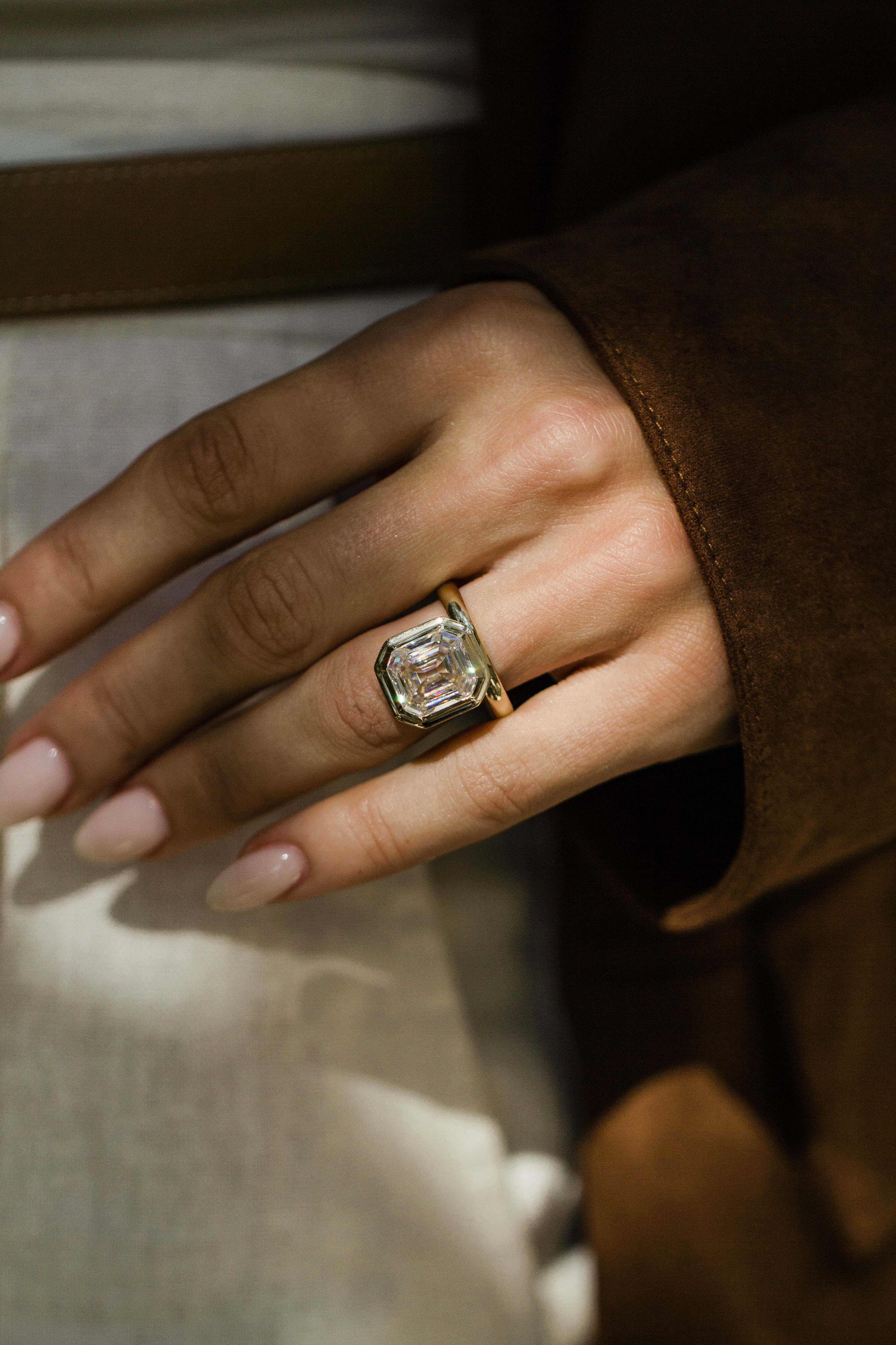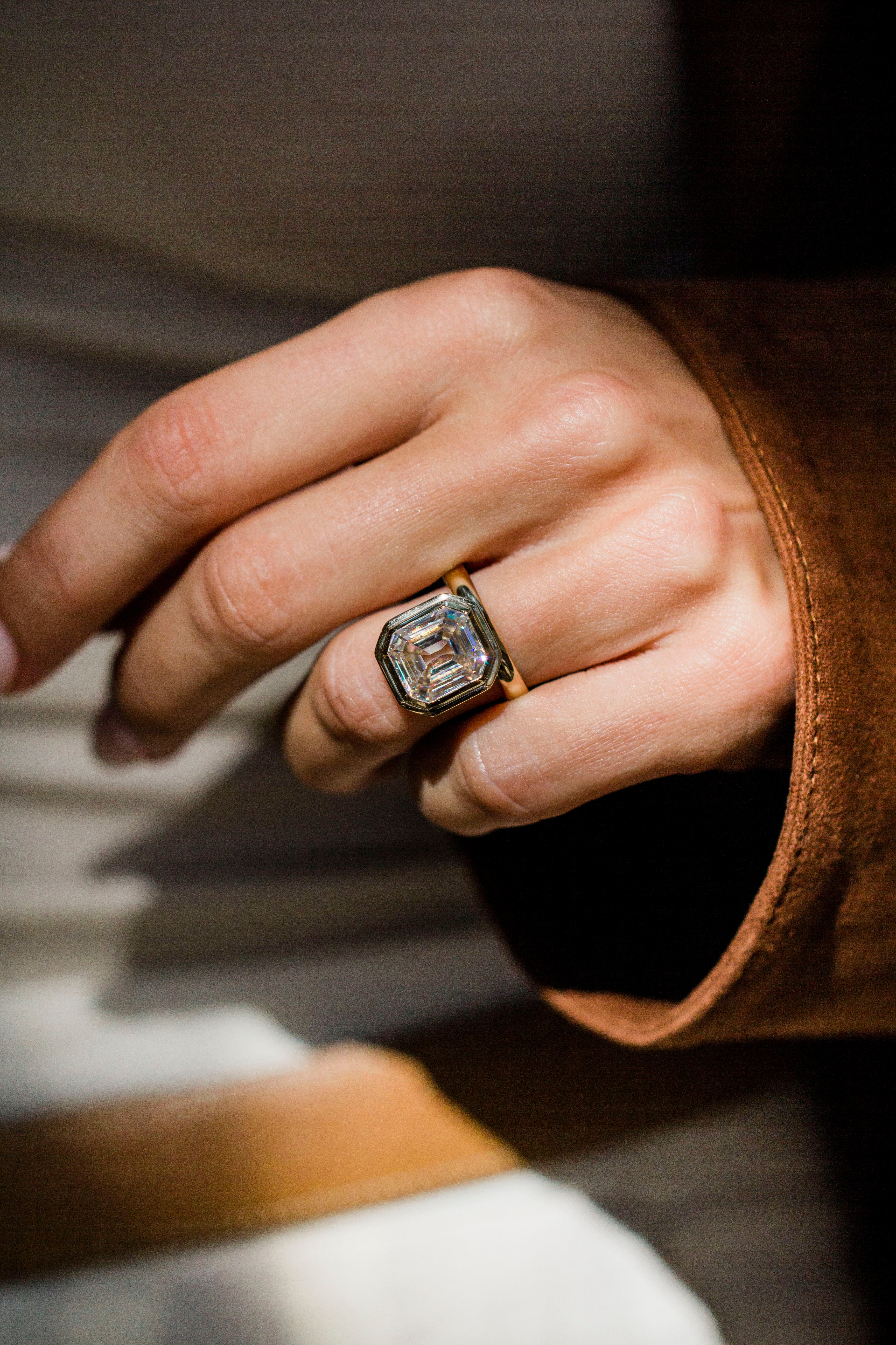 This ring features a 6.6 carat vintage white moissanite Old Mine Asscher set in our signature Luna setting. The 3mm solitaire waved band, paired with a supportive donut, keeps the stone perfectly anchored to the finger—effortlessly secure and elegant. The standout detail? A stepped bezel that gives this ring its ultimate cool-girl edge. Please note that adding a donut sets the stone low, so most traditional wedding bands won’t stack perfectly flush. Want both a donut and a flush fit? Contact us about custom open bands at hello@eastwestgemco.com.