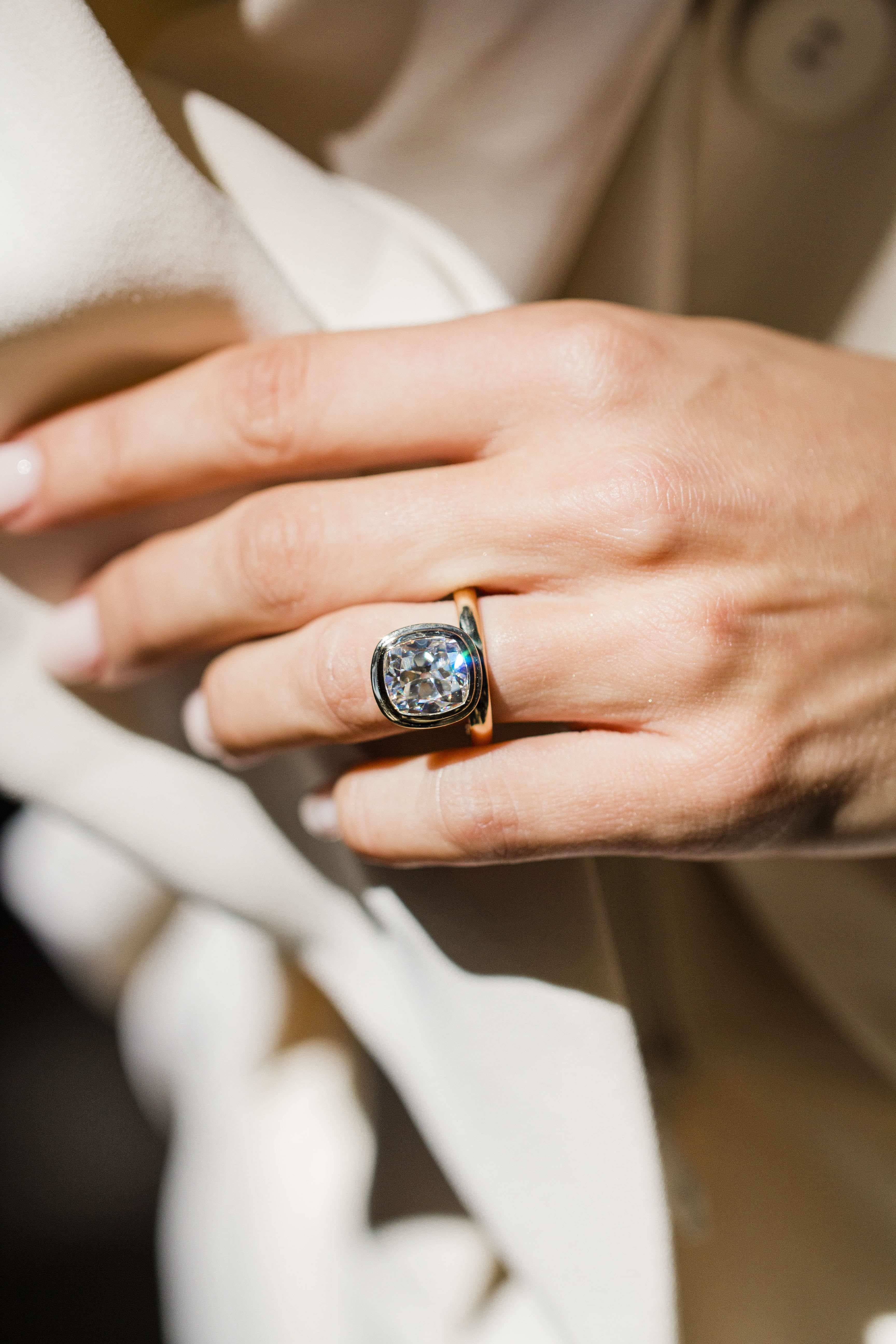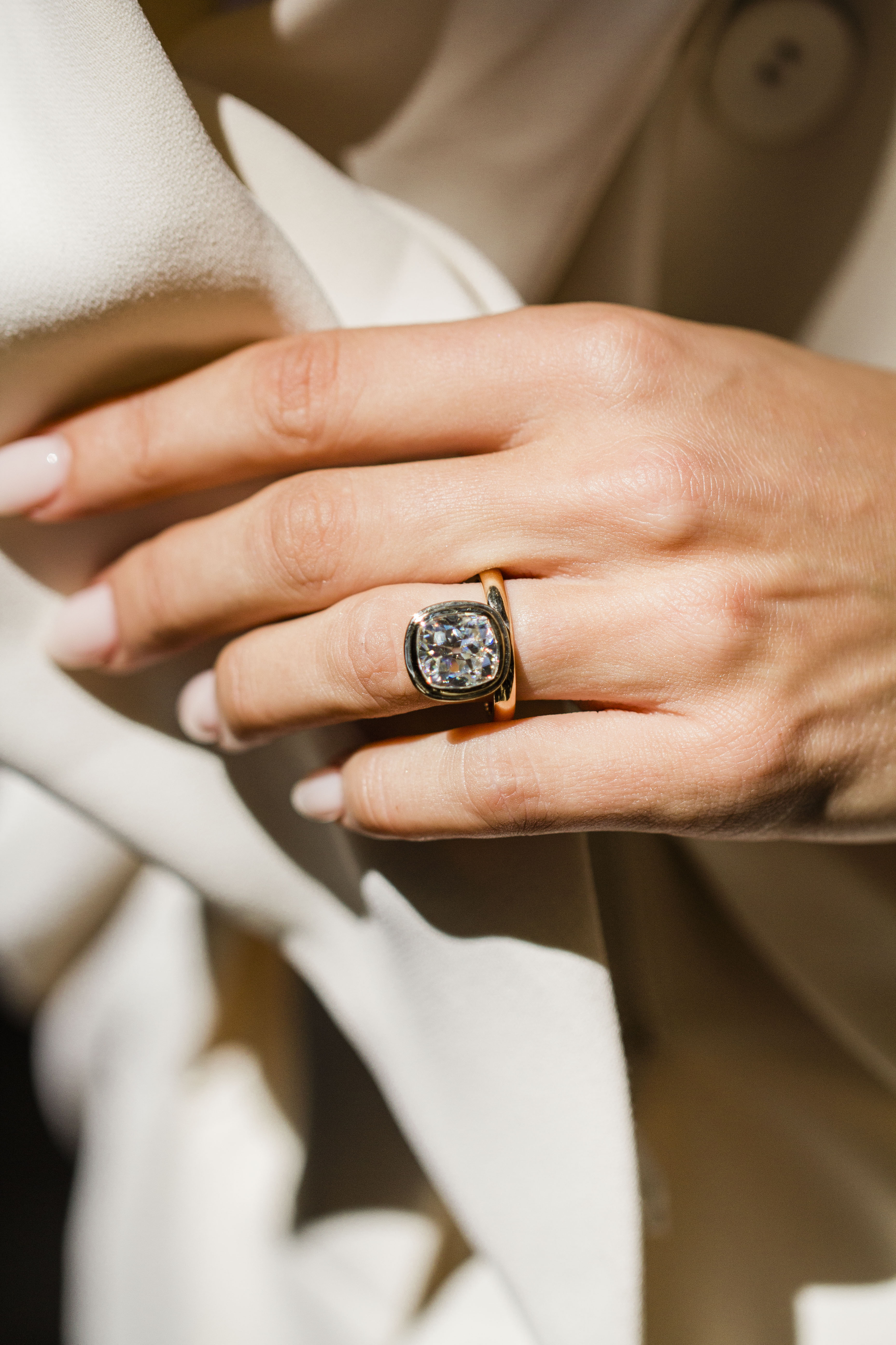 This stunning offset Luna ring features a 4.8 carat vintage white moissanite old mine cushion. The chubby cushion shape adds character to this vintage-meets-classic design. Set on a 3mm solitaire band with a donut and double step bezel for a refined finish. Please note that adding a donut sets the stone low, so most traditional wedding bands won’t stack perfectly flush. Want both a donut and a flush fit? Contact us about custom open bands at hello@eastwestgemco.com.