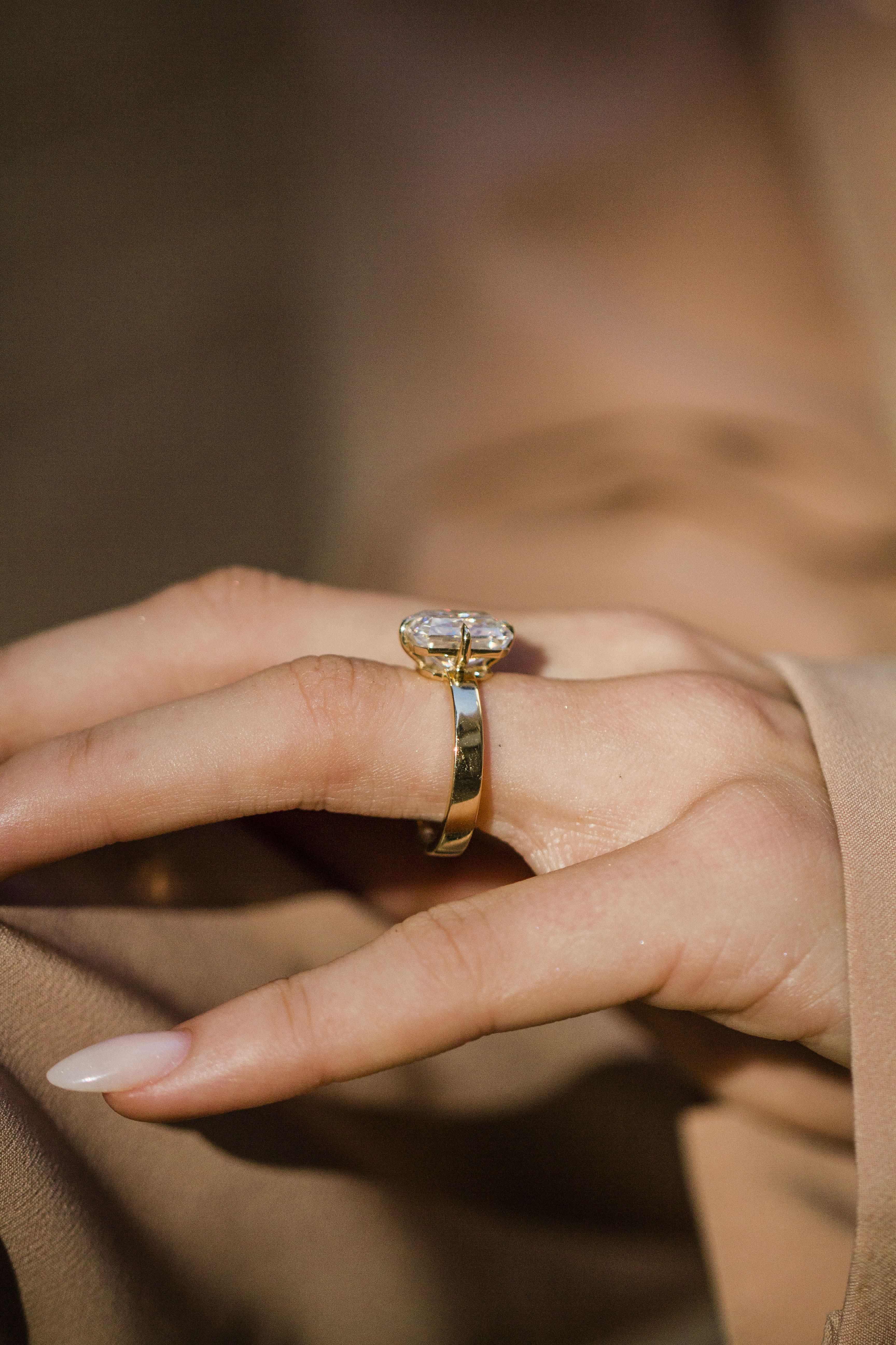 The Mercer ring of our dreams! She features a stunning 5 carat, modern white moissanite, crushed ice hybrid radiant center stone. Positioned on top of a 3.2mm flat squared off solitaire band, single NSEW prongs and a donut to sit low to the finger. Please note that adding a donut sets the stone low, so most traditional wedding bands won’t stack perfectly flush. Want both a donut and a flush fit? Contact us about custom open bands at hello@eastwestgemco.com.