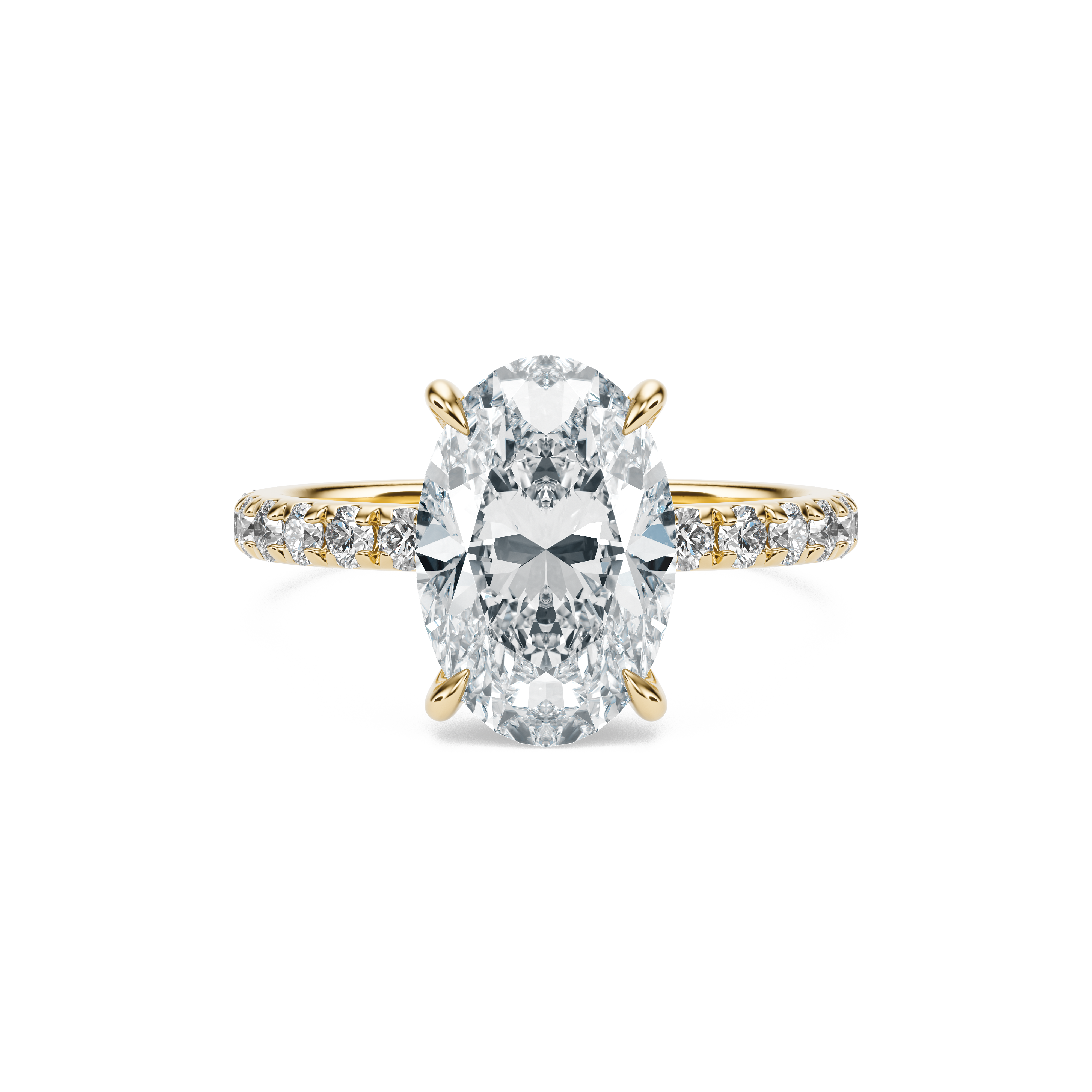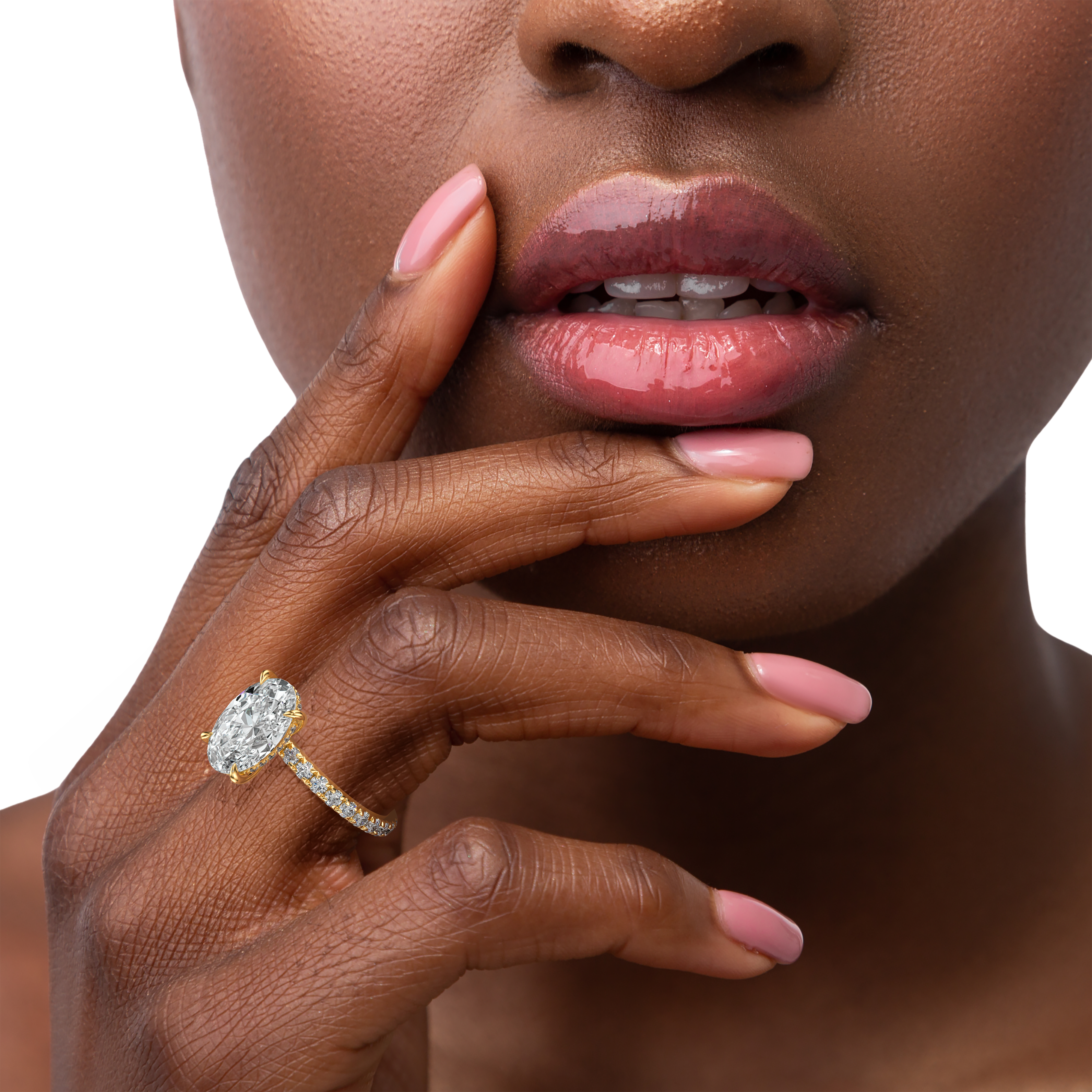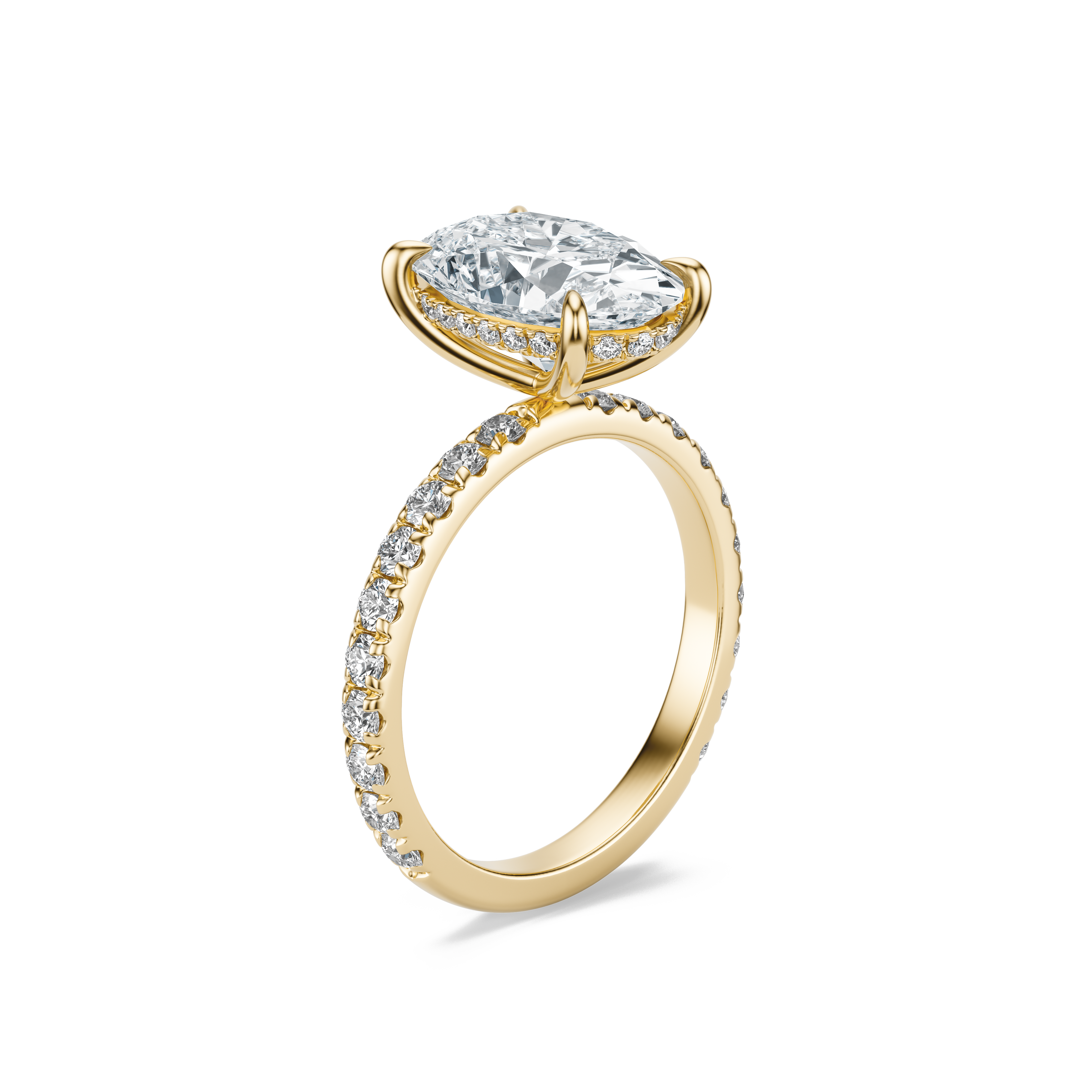 The Standard Portia Ring features 2mm pavé stones set into a 2mm pavé band for the ultimate, stone forward look. The Standard version of this style includes an invisible halo to complete the overall design. If you'd like a center stone larger than 3.5ct, our team strongly recommends adding a donut or cathedral for additional structural integrity. Please note that a donut will set the stone so low that a traditional wedding band won't be able to stack perfectly flush. Want the best of both worlds with a flush stack and a donut? Contact us about our open bands for a custom fit at hello@eastwestgemco.com.