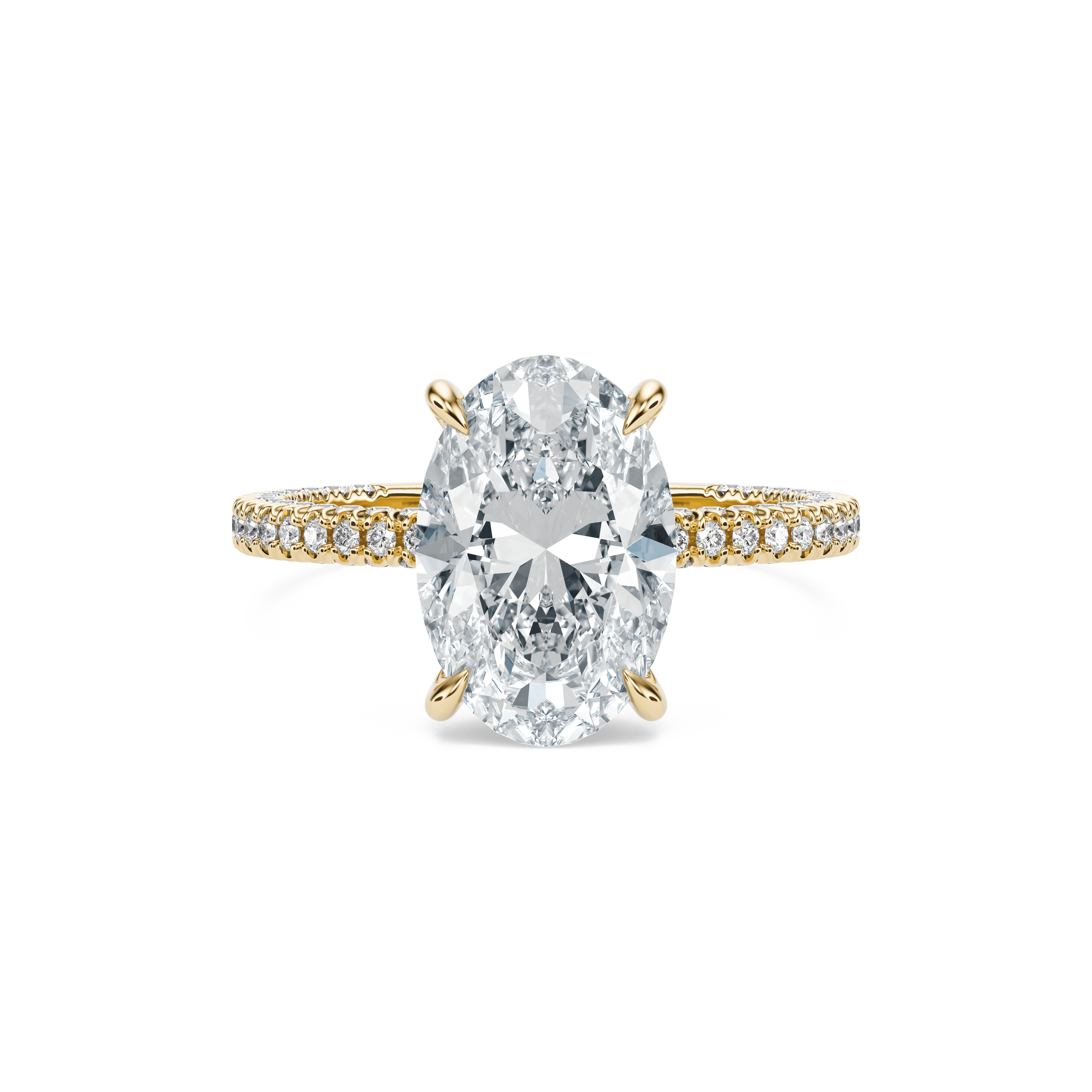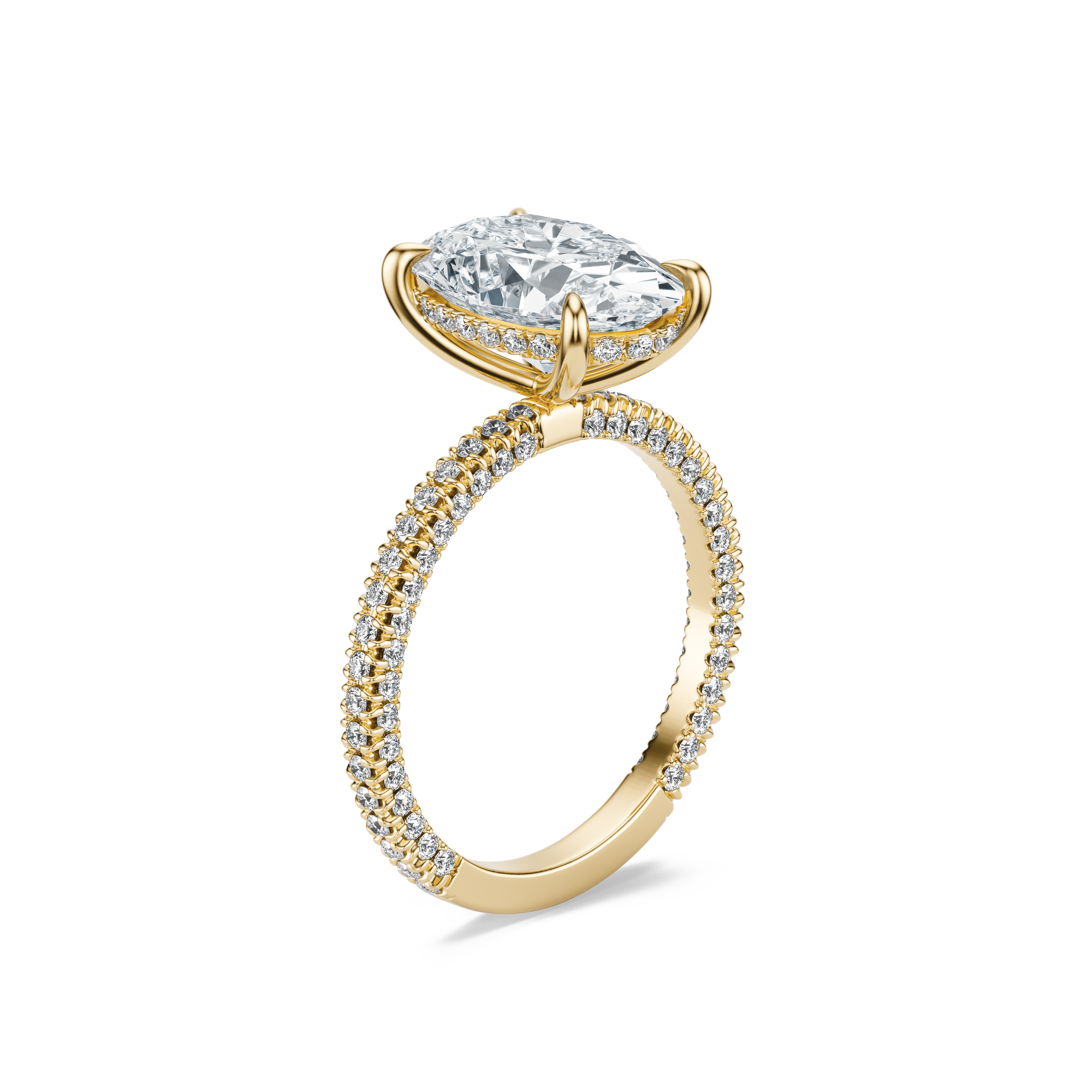 Our Signature Rowan Ring features a 2mm triple micropavé band and an invisible halo. Triple Micropavé is when there is pavé on all three sides of the band for a totally glammed out look. Compared to our Founder Recommended Rowan Ring, our standard version forgoes the double claw prongs and the donut upgrade for those who prefer a ring that sits up a touch higher. If you'd like a center stone larger than 3.5ct, our team strongly recommends adding a donut or cathedral for additional structural integrity. Please note that a donut will set the stone so low that a traditional wedding band won't be able to stack perfectly flush. Want the best of both worlds with a flush stack and a donut? Contact us about our open bands for a custom fit at hello@eastwestgemco.com.