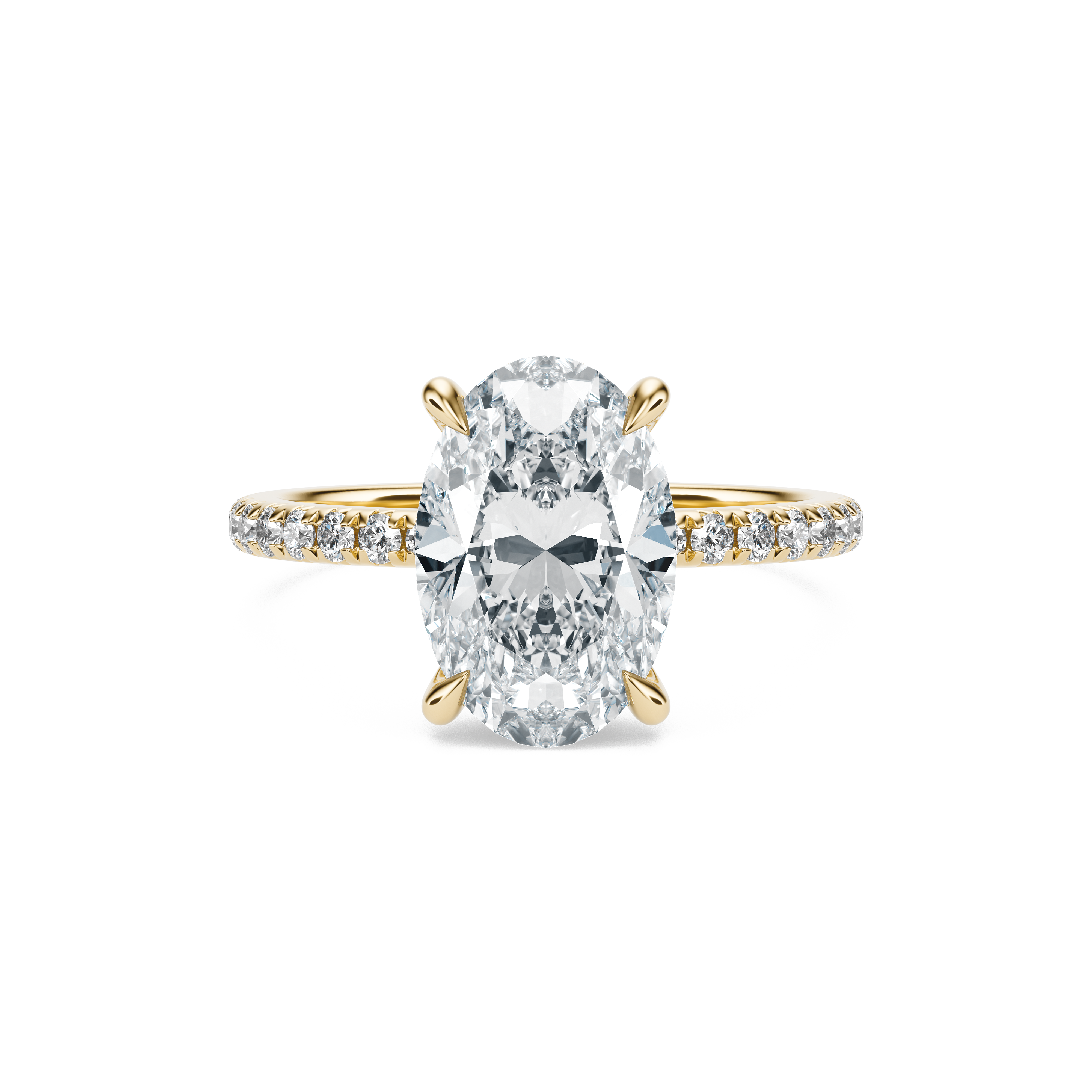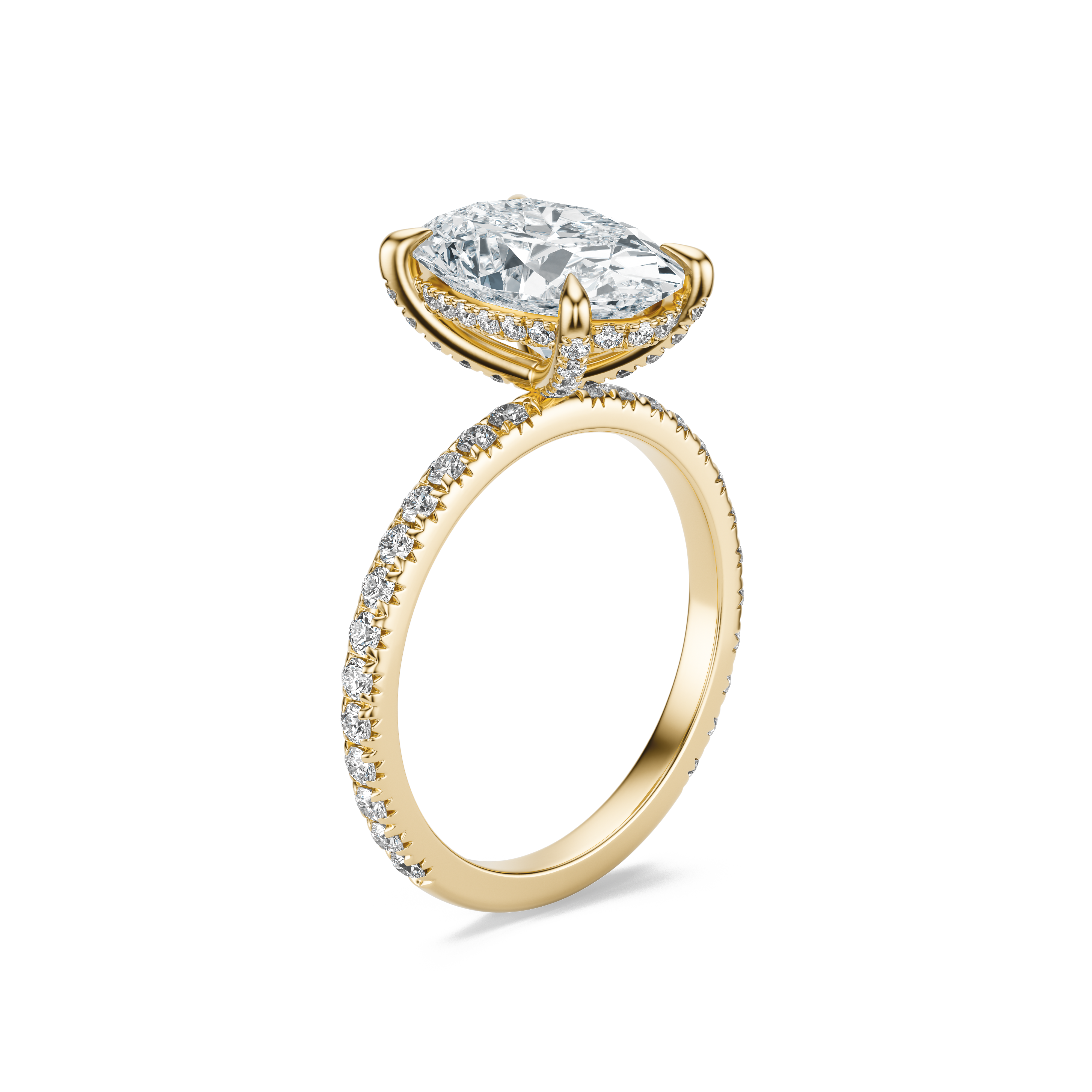 Our Standard Sutton Ring has French pavé details that are individually hand-notched by our artisans. This detail can be seen from the side profile of the band, showing “W” shaped notching rather than “U” shaped notching for an additional, delicate design detail. This version also features an invisible halo and pavé underside. If you'd like a center stone larger than 3.5ct, our team strongly recommends adding a donut or cathedral for additional structural integrity.