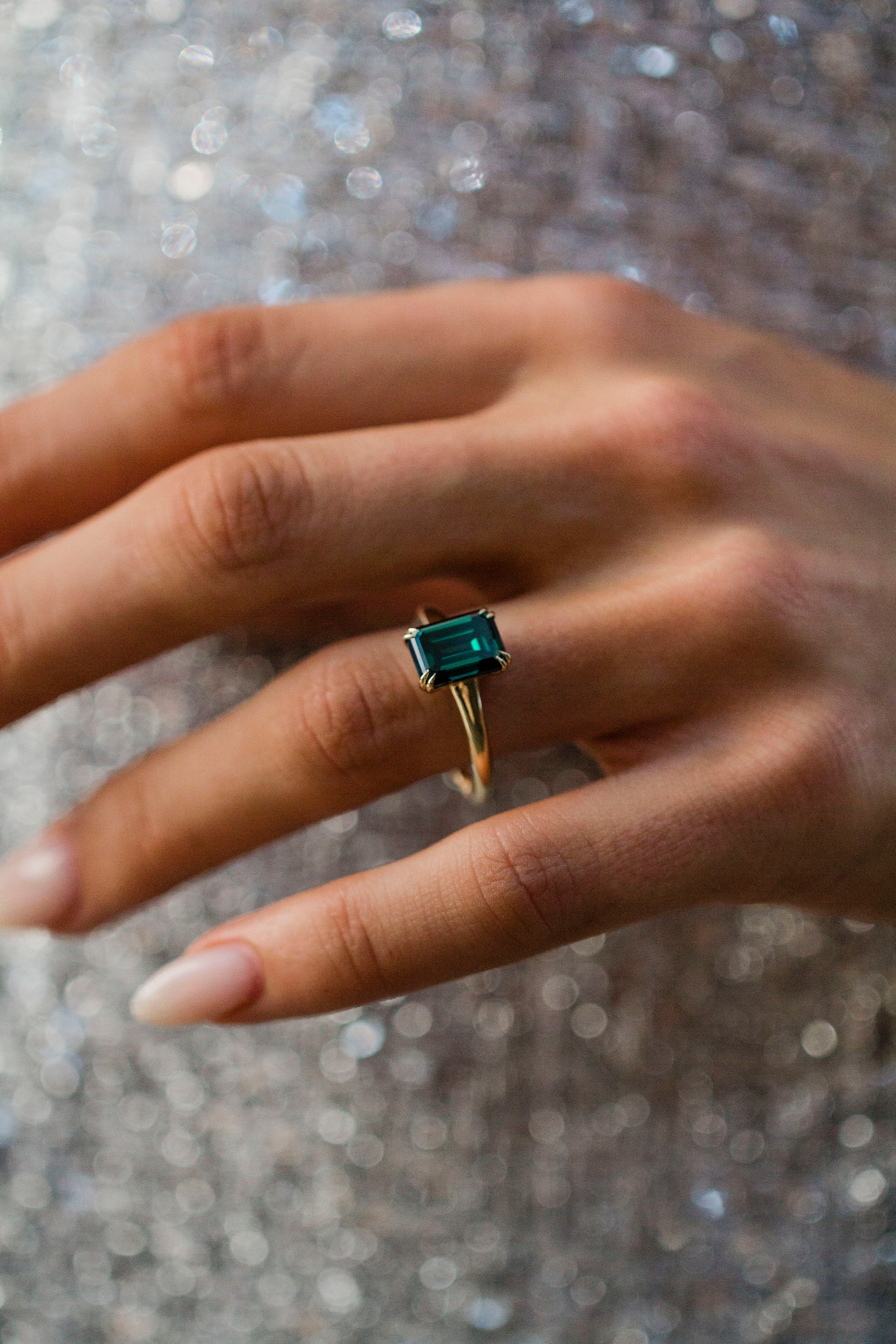 This Willa ring features a romantic 2.7 carat, fancy dark green, step cut emerald moissanite center stone. She’s set completely in 14K yellow gold to beautifully accentuate the center stone, and finished with a 1.5–2.9mm reverse-tapered solitaire band, a classic donut, and elegant double claw prongs. She’s timeless with a moody, modern twist. Please note that adding a donut sets the stone low, so most traditional wedding bands won’t stack perfectly flush. Want both a donut and a flush fit? Contact us about custom open bands at hello@eastwestgemco.com.