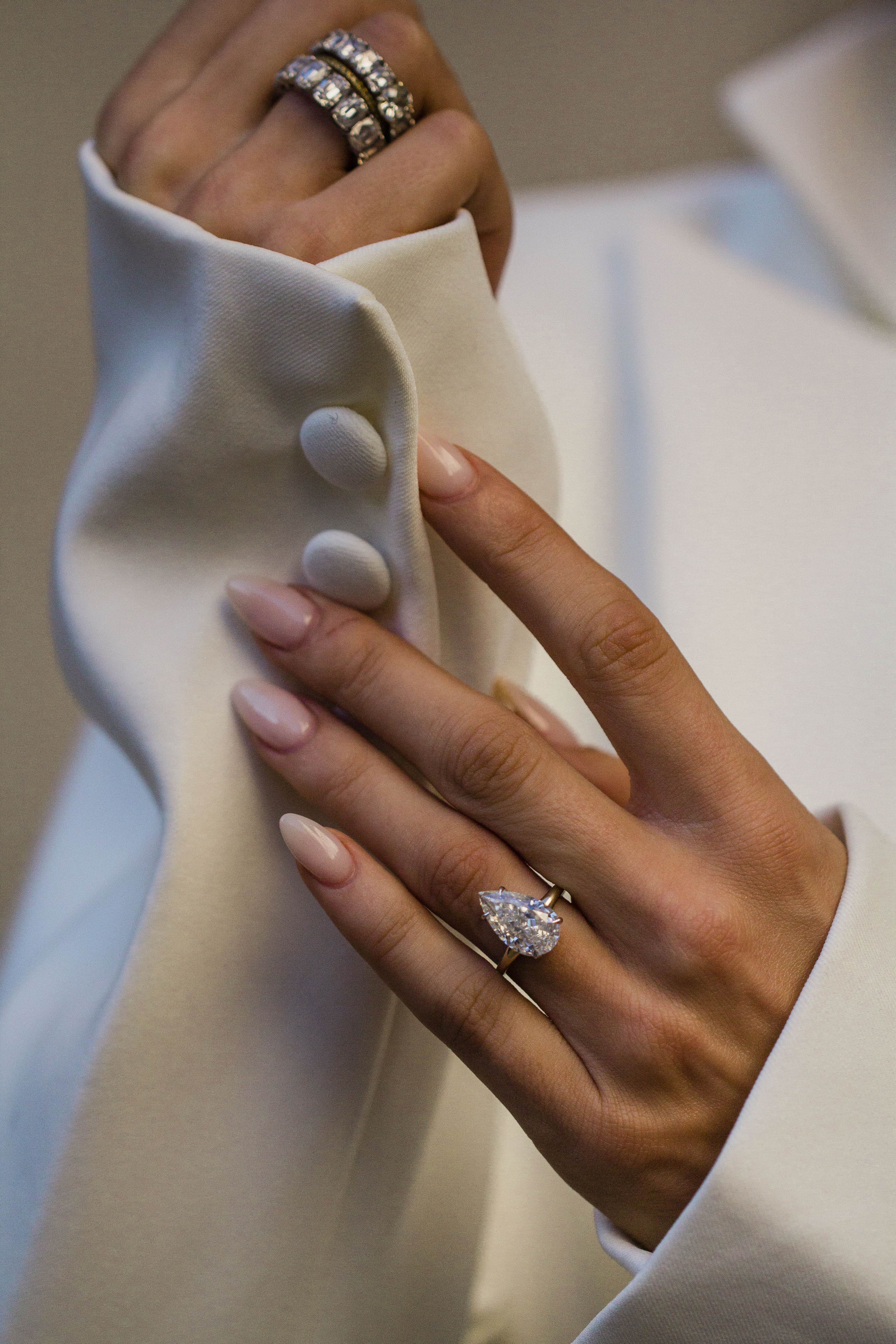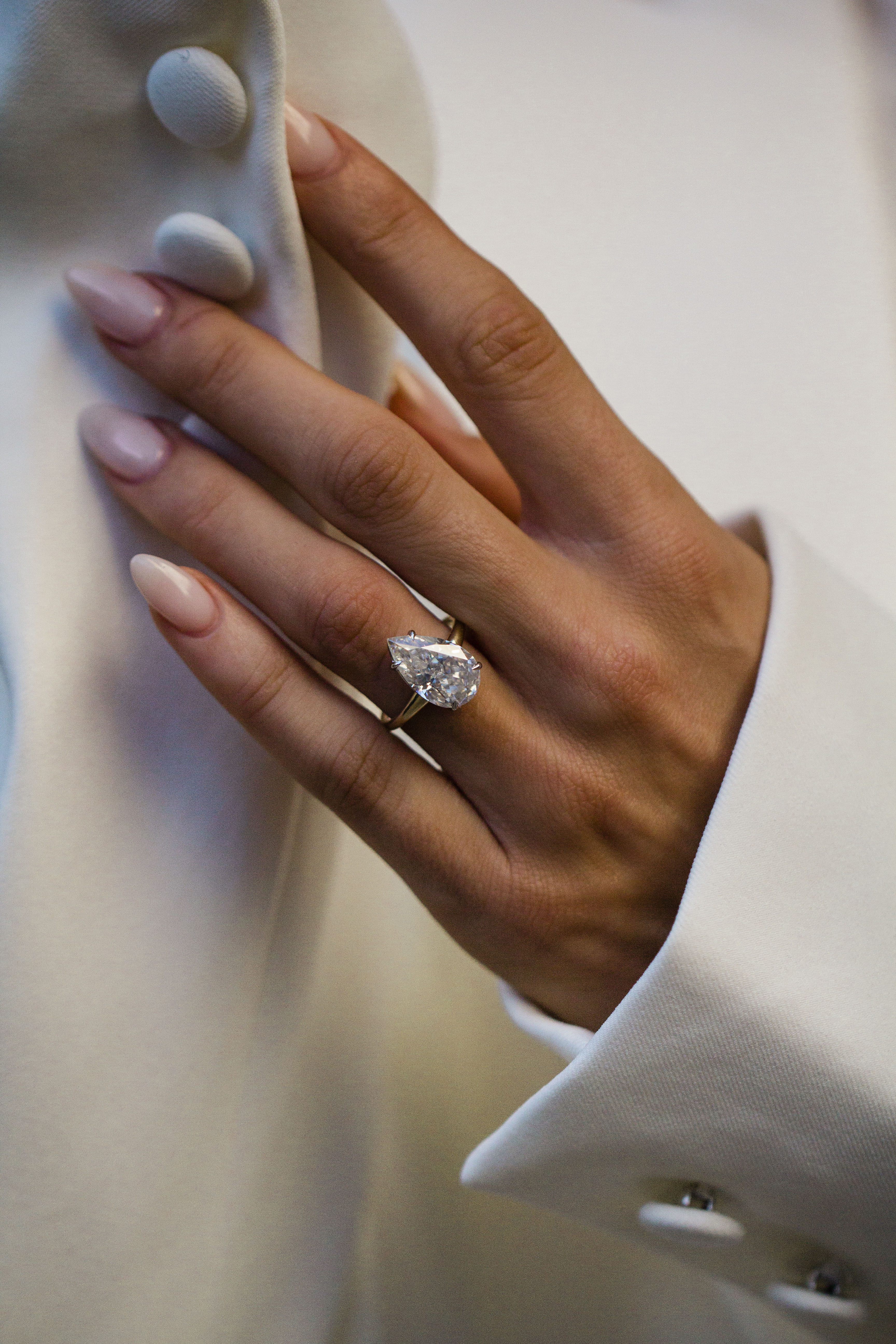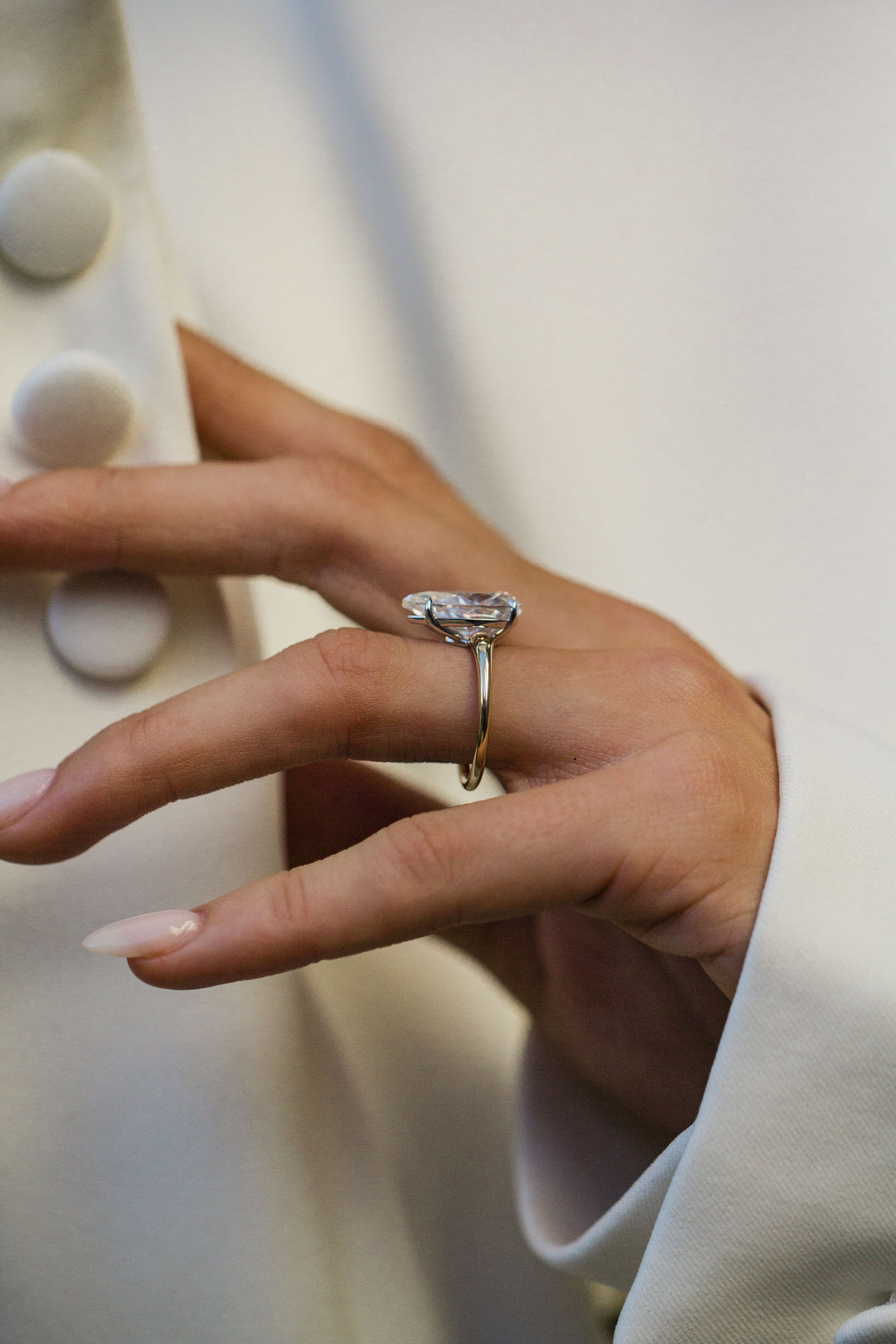 This Willa features a stunning 6.8 carat modern white moissanite crushed ice hybrid pear center stone. Set with a 14K white gold head and a 14K yellow gold band, she’s perfect for the girl who loves a mixed metal look. The ring showcases a 1.8mm to 2.9mm reverse tapered solitaire band, a supportive donut to protect the center stone, and single claw prongs for a delicate, elevated finish.